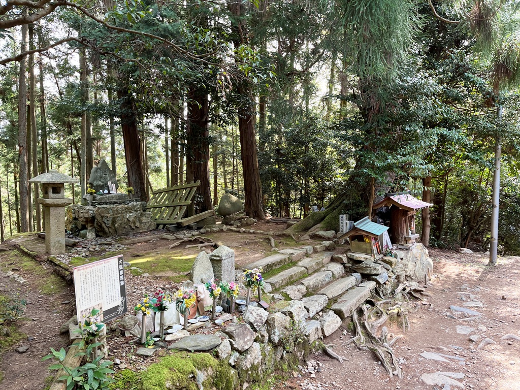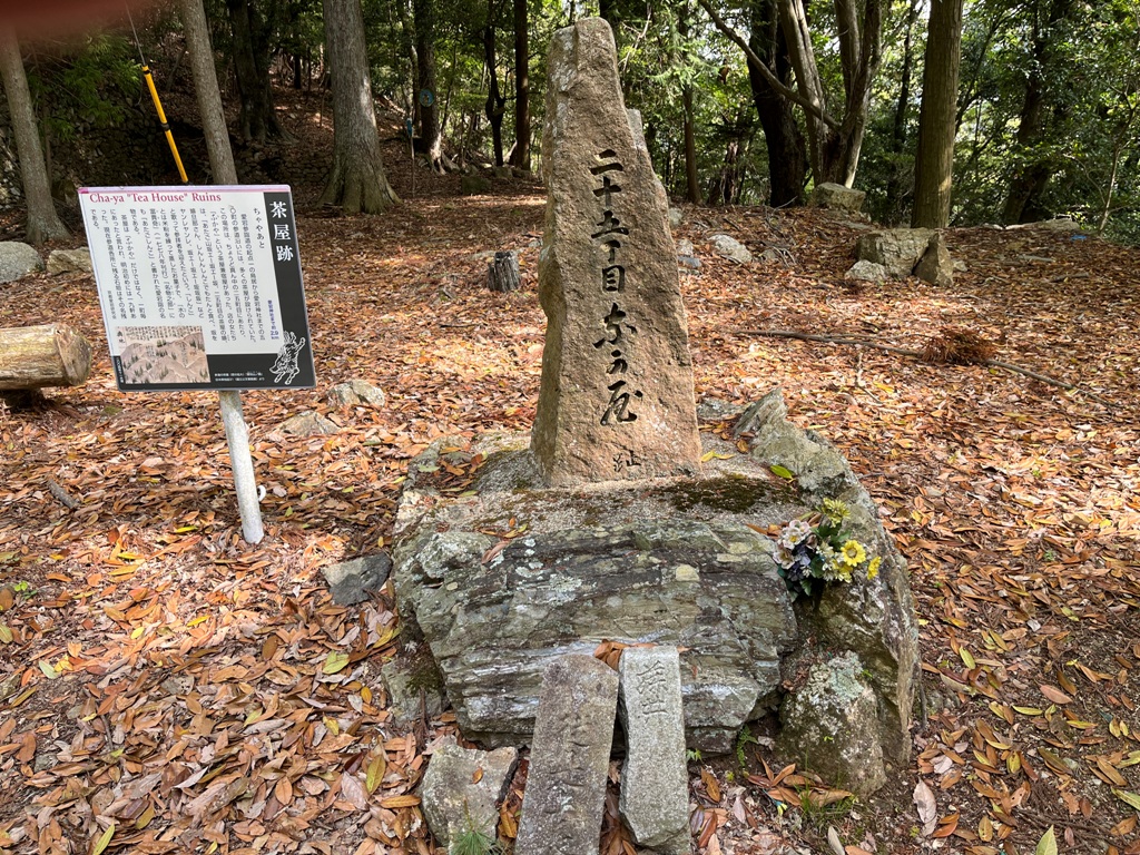 次に火燧権現跡があり、石碑に花が供えられていた。更にその先にだだ広い二十丁目一文字屋跡が続く。暫く急坂を登って行くと、「二十丁目です。・・・一の鳥居(平野屋前)から五十丁で山頂・愛宕神社です」なる看板があった。それを信じると既に4割方登ったことになる。茶屋跡には「二十五丁目ふかほ」と刻んだ石碑があり、説明文にこの場所がちょうど真ん中の二十五丁にあたると記している。そこに休憩所が設置されていた。そこから5分程上ると五合目休息所があり、そこに三十丁目水口屋敷跡の案内表示があった。その先に、先ほどの表示とは別に22/40とコメントが書かれた黄色い看板があった。