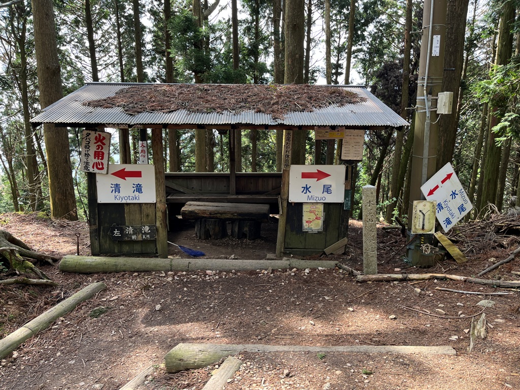 水尾別れ手前にも、「もうすぐ水尾別れ自分のペースでコツコツと30/40」と書いた黄色い看板があった。水尾別れに休息所があり、その傍にも31/40の表示があった。どうも愛宕神社までの距離4kmを40分割して100m毎に置かれているようだ。そこから北方向に進むとハナ売場の説明がある茅葺の建物に着く。
