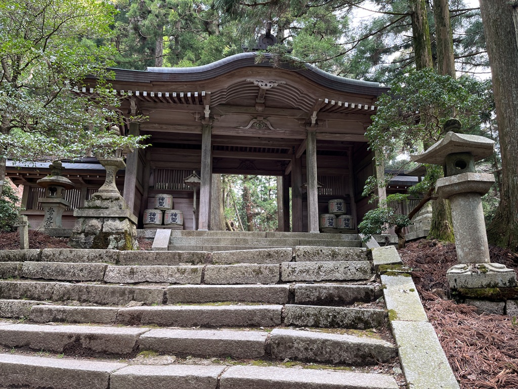 建物横から石段を10分程を上ると立派な門が見えてくる。黒門でかっては京口惣門とも呼ばれていた。石段は門を潜っても続いている。石段を上りきると、やがて両側に石灯篭が置かれた境内の平らな道となる。境内を通り抜けた先に、神門まで長い急な石段が連続する。