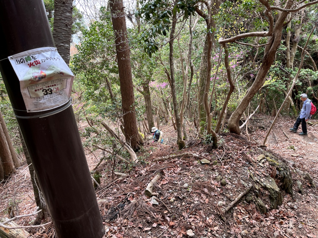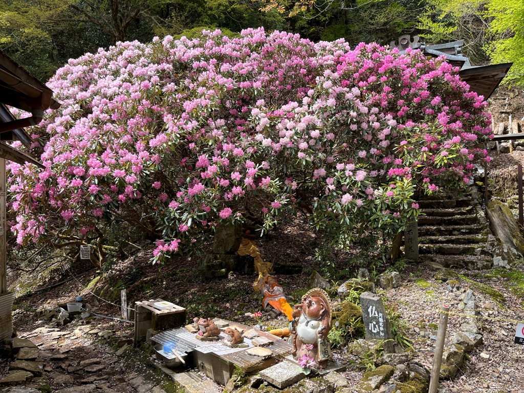 月輪寺境内に入る手前に乱雑な手書きの注意書きがあった。境内に入ると大輪のシャクナゲが見事な花を咲かせていた。月輪寺本殿に参拝すると早々に通り抜ける。そこからは何の変哲もない登山道を、パンザマストに貼られた○/36のカウントダウンを確認しながら下山する。右しぐれの桜の石柱を過ぎると、程なく月輪寺入口に達する。その先に空也瀧の案内があったが、そのまま林道に出る。