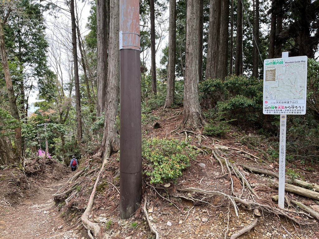 ここまで、往路2時間、復路1時間半の所要時間で大幅に時間短縮出来た。予定では林道を金鈴橋まで戻り、清滝バス停から帰ることにしていた。時間に余裕が出来たため計画を変更して、林道途中の道標北山93から北山西部コ-スの3.1kmを歩くことにした。このコースは、3日前から昨日にかけて歩いた京都一周トレイル北山、西山コースで