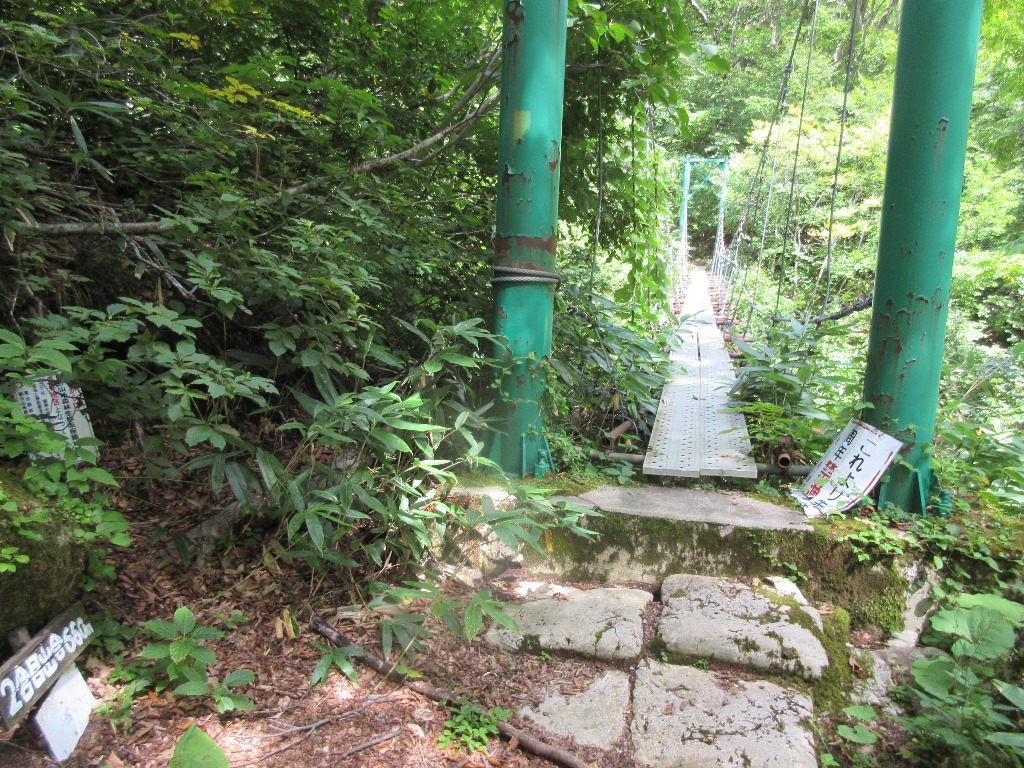If you go down a little from the mountain trail next to "Asahi mineral spring Naturalist House" and cross the suspension bridge next to "Saruwatari Water intake", you will be guided to the mountain trail.The mountain trail passes through "Mt. Toriharayama" and "Mt. Mikagemoriyama" and continues through the beech forest along the main stream of the Asahi River.Crossing the suspension bridge is the 2Km point font>. It will be a good start with 26 minutes so far. From here, repeat the up-down a little and reach the 4km point in 1 hour and 10 minutes from the departure. Crossing two suspension bridges from there is the second point at an altitude of 660m font>.