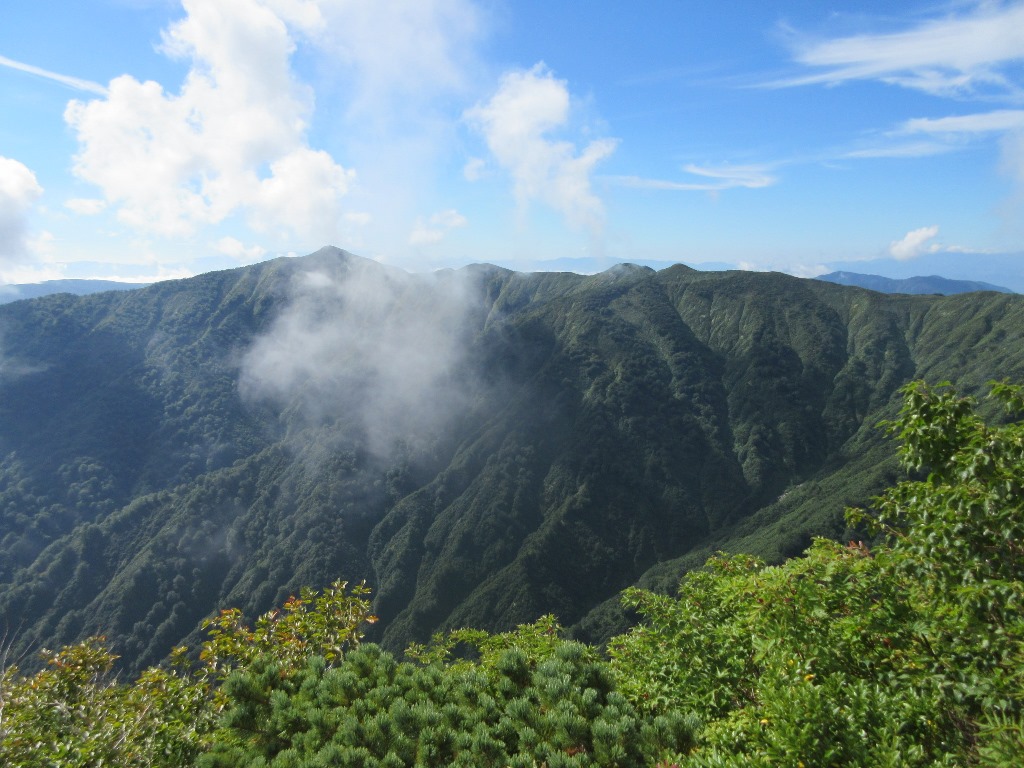 Finally, the remaining 4km and the altitude difference of 1,100m will start full scale climbing.Especially on the steep slopes from the 2/10 stage to the 4/10 stage, it has been easy so far, so it suddenly becomes painful.Rest for about 10 minutes at the Tyoumeisui branch of 4/10 stage font>.The slope becomes a little gentle, but the winding ridge walk continues.Occasionally, Mt.Koasahidake, Mikagemoriyama ridgeline font> opens, and the tiredness is healed.The pace gradually drops, but the field of view is gradually widening.The peak can be seen in front of you from the 9/10 stage, but Mt. Ooasahidake is beyond that.The summit is 9:56 and it takes about four and a half hours to reach the mountain.During that time, I didn't meet anyone, and Mt. OoAsahi daaaaake(1,870m) summit font> was monopolized.It took a little bit of gas, but I enjoyed the panorama from the summit for a while.After a while, a single climber and a climber with two climbed up.A single person climbs a day trip from Kotera Kousen. and two people stay at a mountain lodge and go down to the same Asahi Kousen as me.