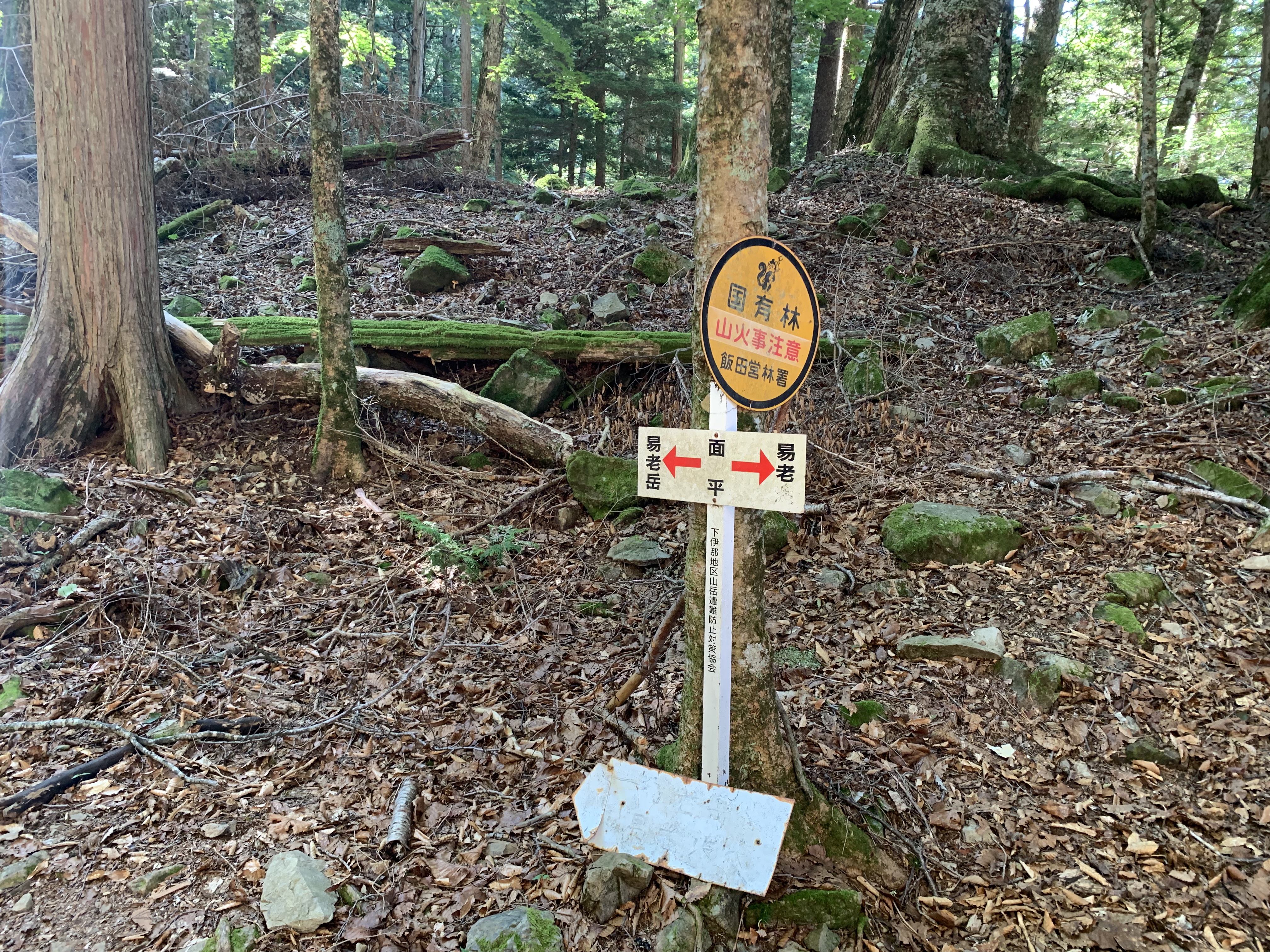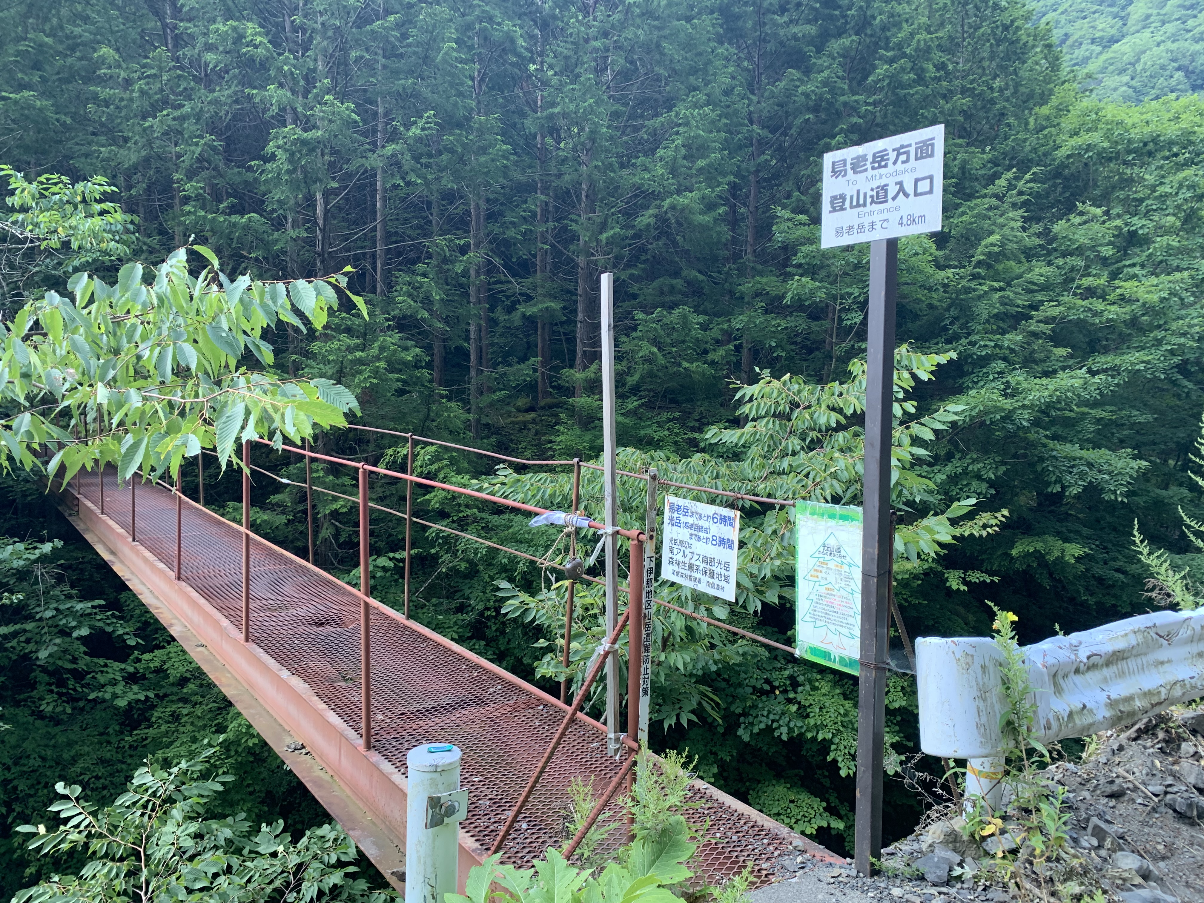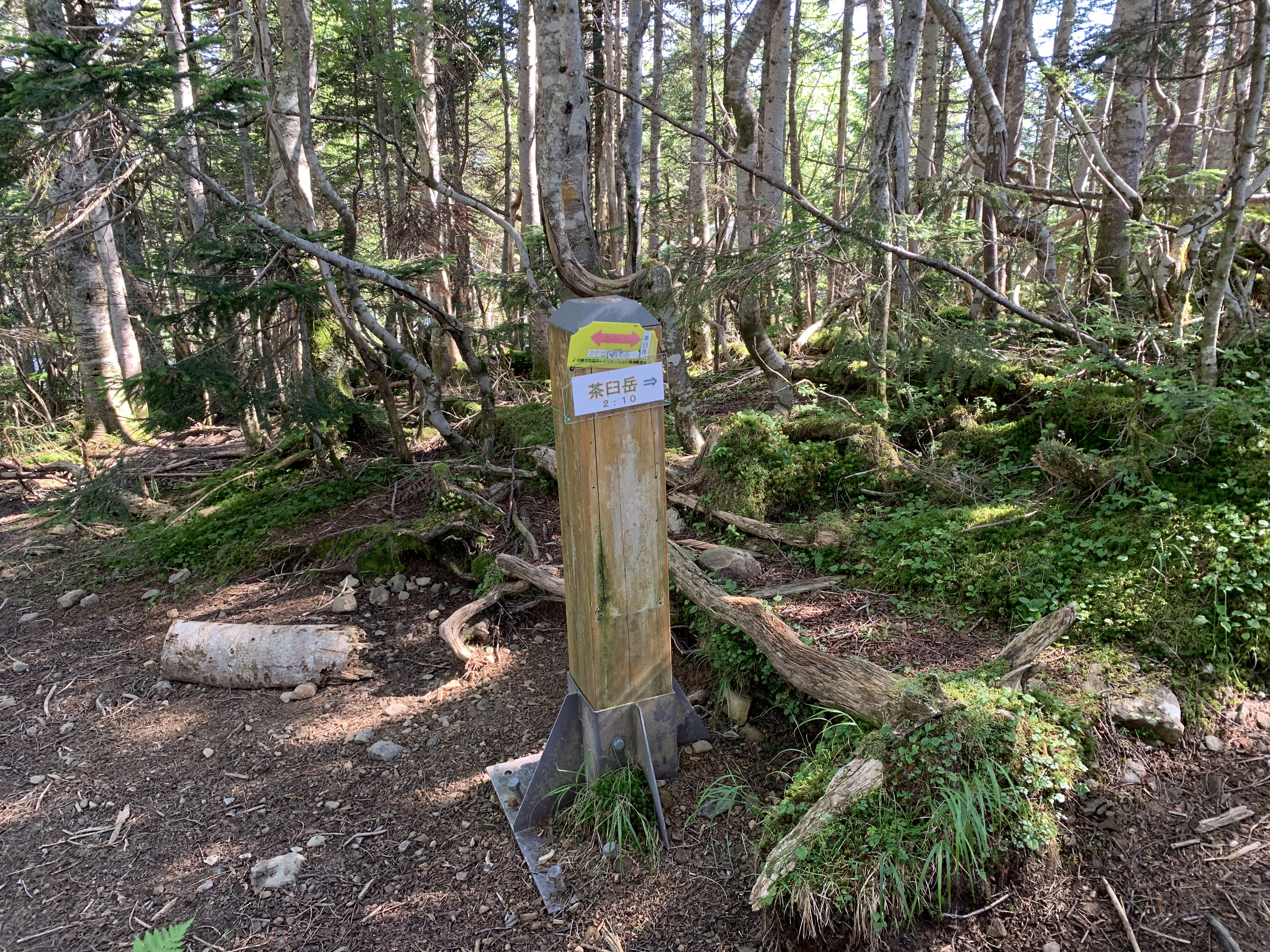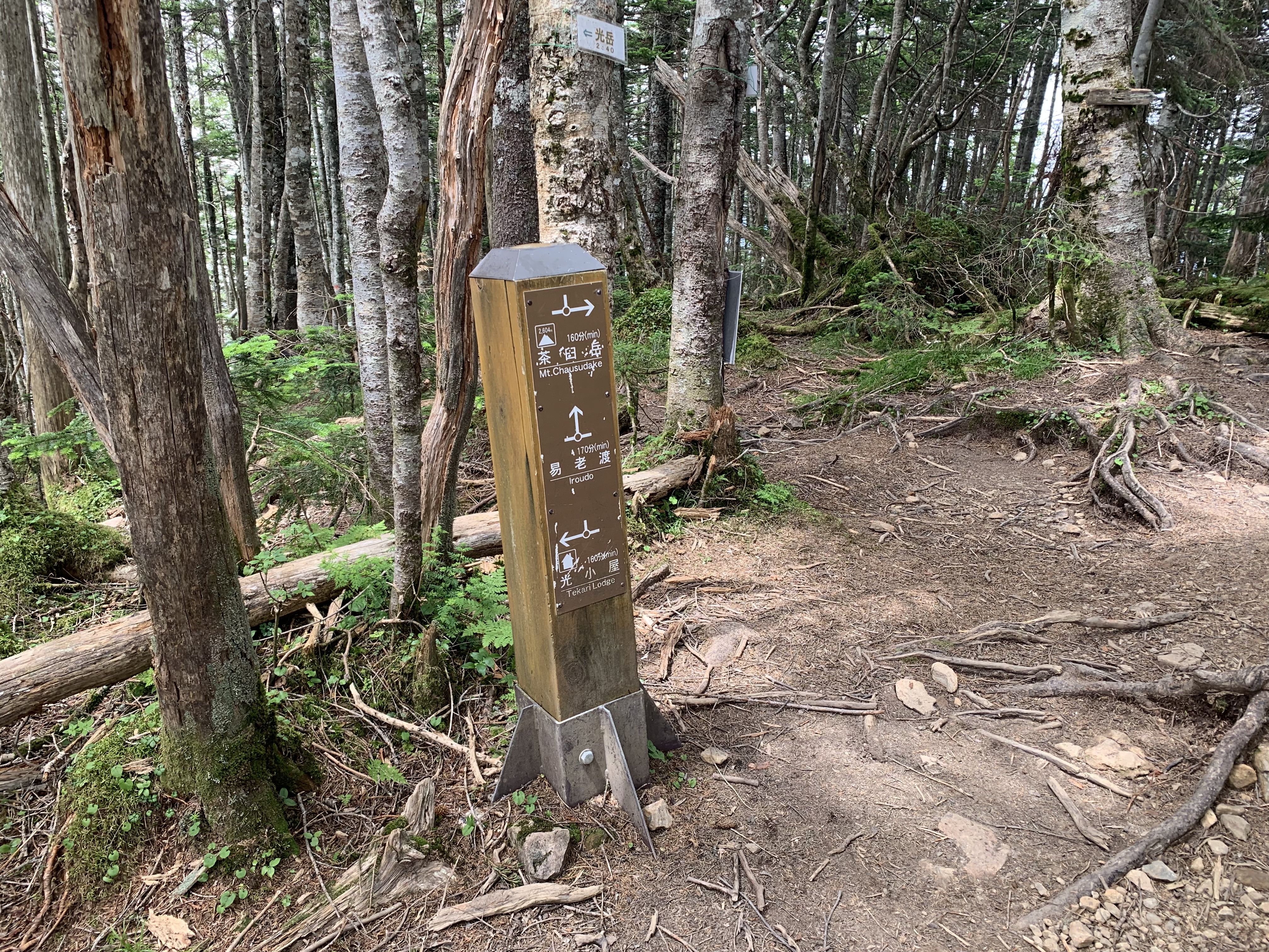 芝沢駐車場で朝食を済ませ、5時31分に芝沢ゲ-トに入る。ゲ-トから約1Km先と、更にその約1Km先に、道路流出のため山側に大きく迂回している。易老岳、光岳登山口まで4Km程あり、1時間11分かかる。易老岳、光岳登山口看板のところの橋を渡ると、本格的な登山道となる。ずっと樹林帯の中の歩行で、暑さが緩和される。10段階の表示があり、気分的に励みになる。その間2Kmあるので、200m毎(距離割であれば)に表示されている計算だ。⑤まで39分、面平⑩まで1時間32分要す。