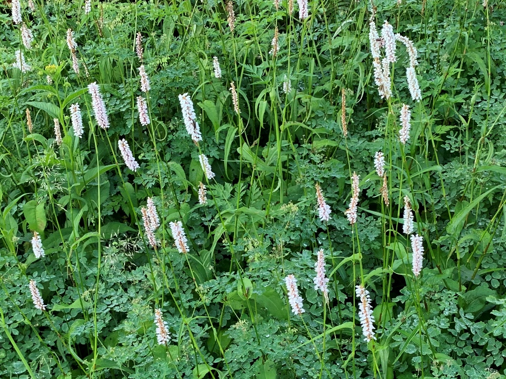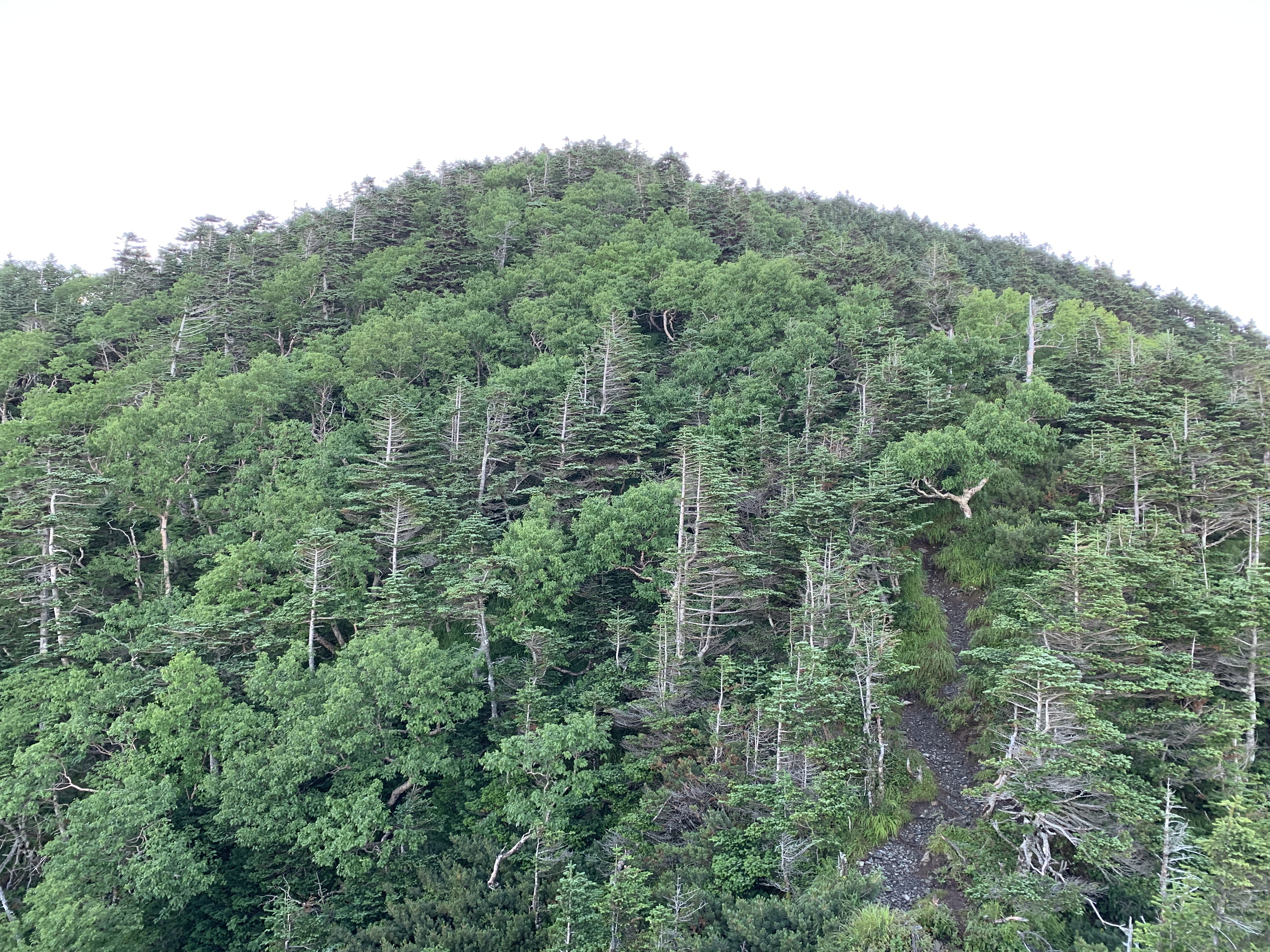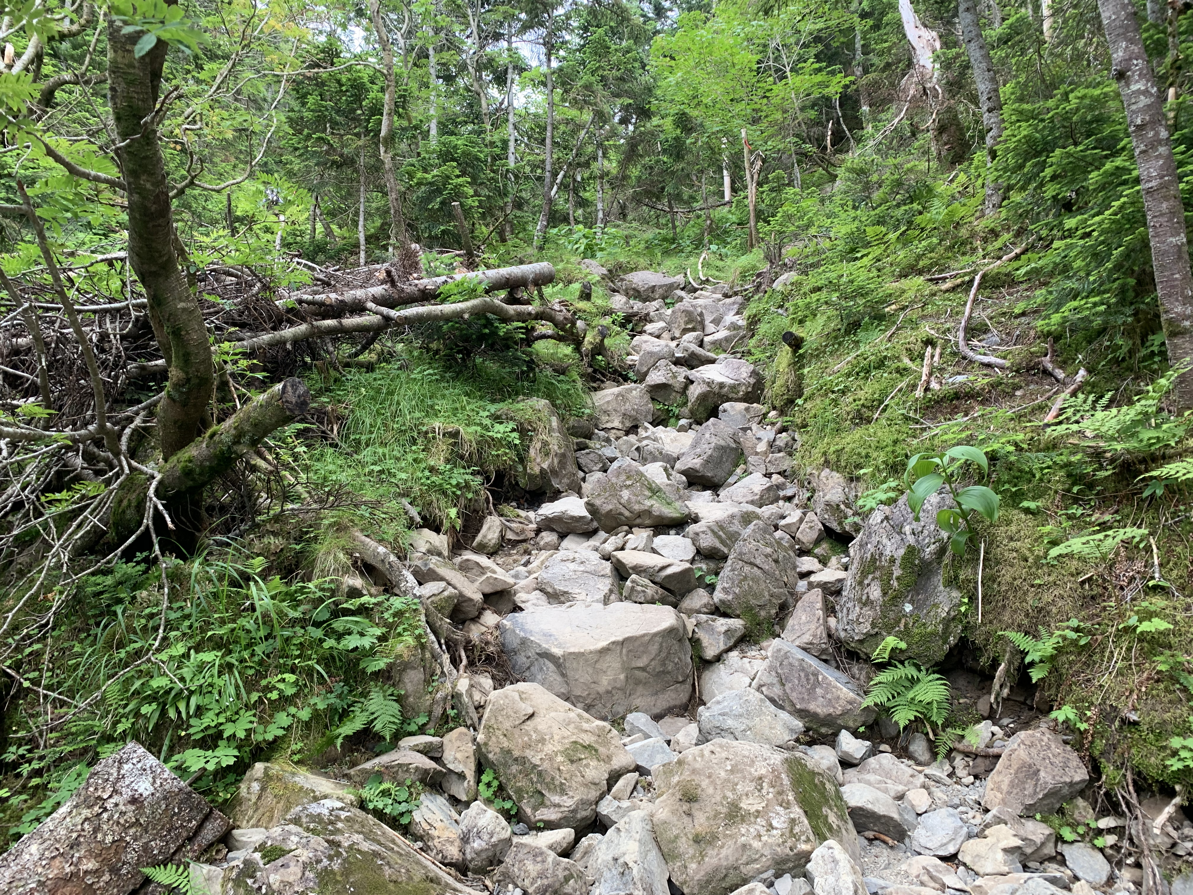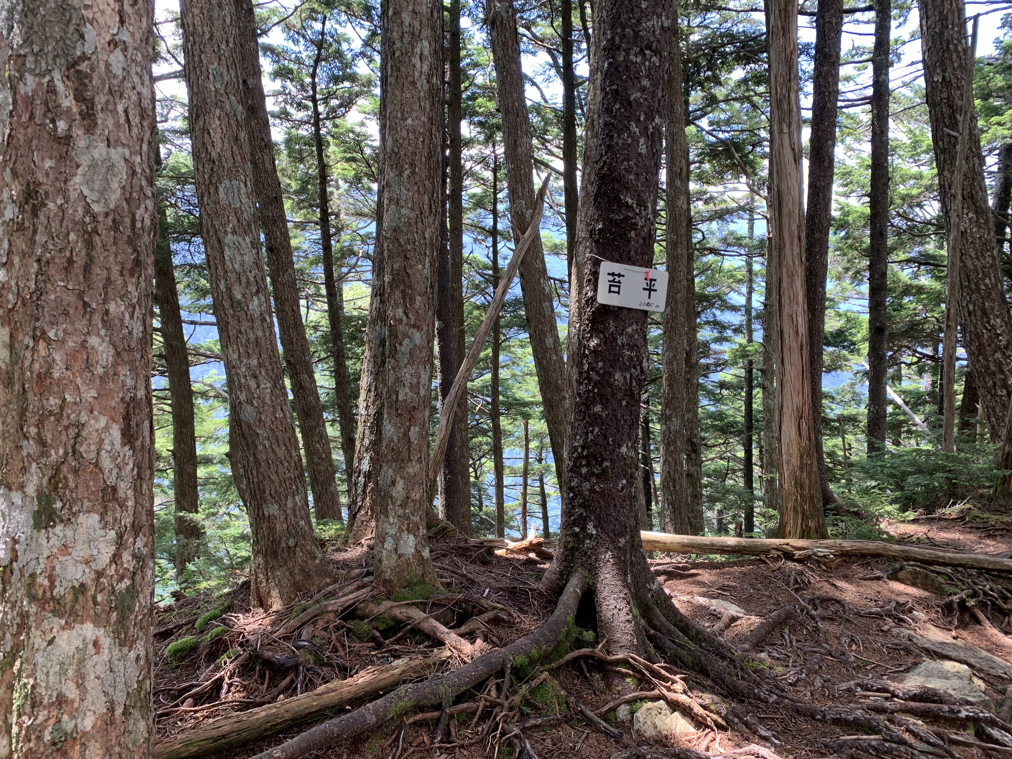 芝沢駐車場で朝食を済ませ、5時31分に芝沢ゲ-トに入る。ゲ-トから約1Km先と、更にその約1Km先に、道路流出のため山側に大きく迂回している。易老岳、光岳登山口まで4Km程あり、1時間11分かかる。易老岳、光岳登山口看板のところの橋を渡ると、本格的な登山道となる。ずっと樹林帯の中の歩行で、暑さが緩和される。10段階の表示があり、気分的に励みになる。その間2Kmあるので、200m毎(距離割であれば)に表示されている計算だ。⑤まで39分、面平⑩まで1時間32分要す。