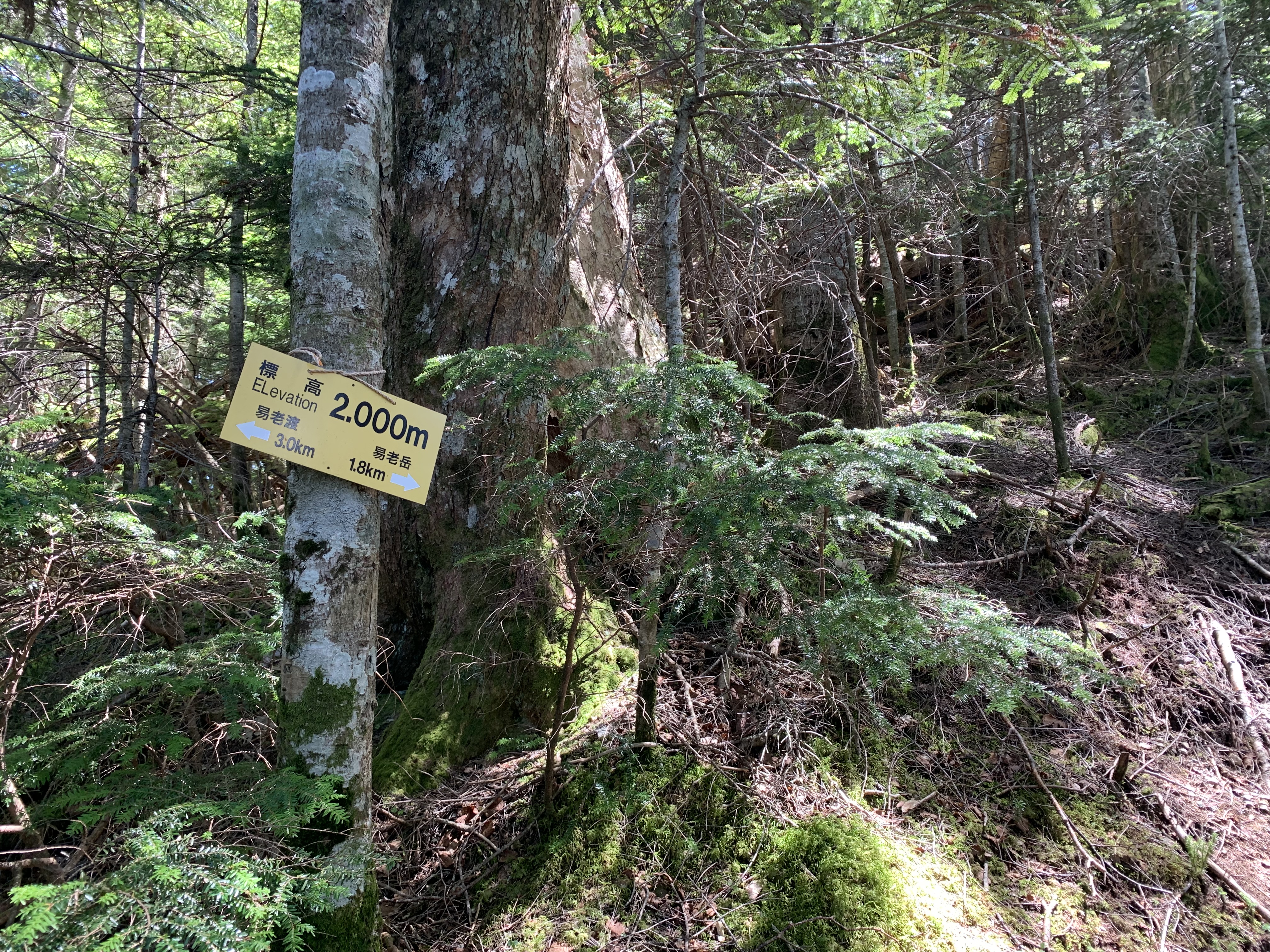 面平から易老岳までは2.8Kmの急な上りが続く。その登山道も⑩から㉚まで表示があり、20段階ある。距離が2.8Kmあるので、140m毎(距離割であれば)に表示されている計算だ。5段階毎の所要時間は⑮まで40分、⑳まで1時間5分、㉕まで1時間9分、㉚まで56分と1時間前後かかっている。易老渡~面平⑤を過ぎると、勾配が急になっていることがタイムで一目瞭然だ。⑳の先に標高2,000mと易老渡から3Km、易老岳まで1.8Kmの表示がある。同行者が易老岳直前の㉙付近で引返すと云ったのにはびっくりした。私もへばり気味だったので、暫く休憩すると体力を取り戻したようだ。程なく易老岳分岐(2,354m)に達する。12時43分到着で、面平から3時間50分かかる。コ-スタイムが3時間なので、二人ともかなりへばったことが解る。