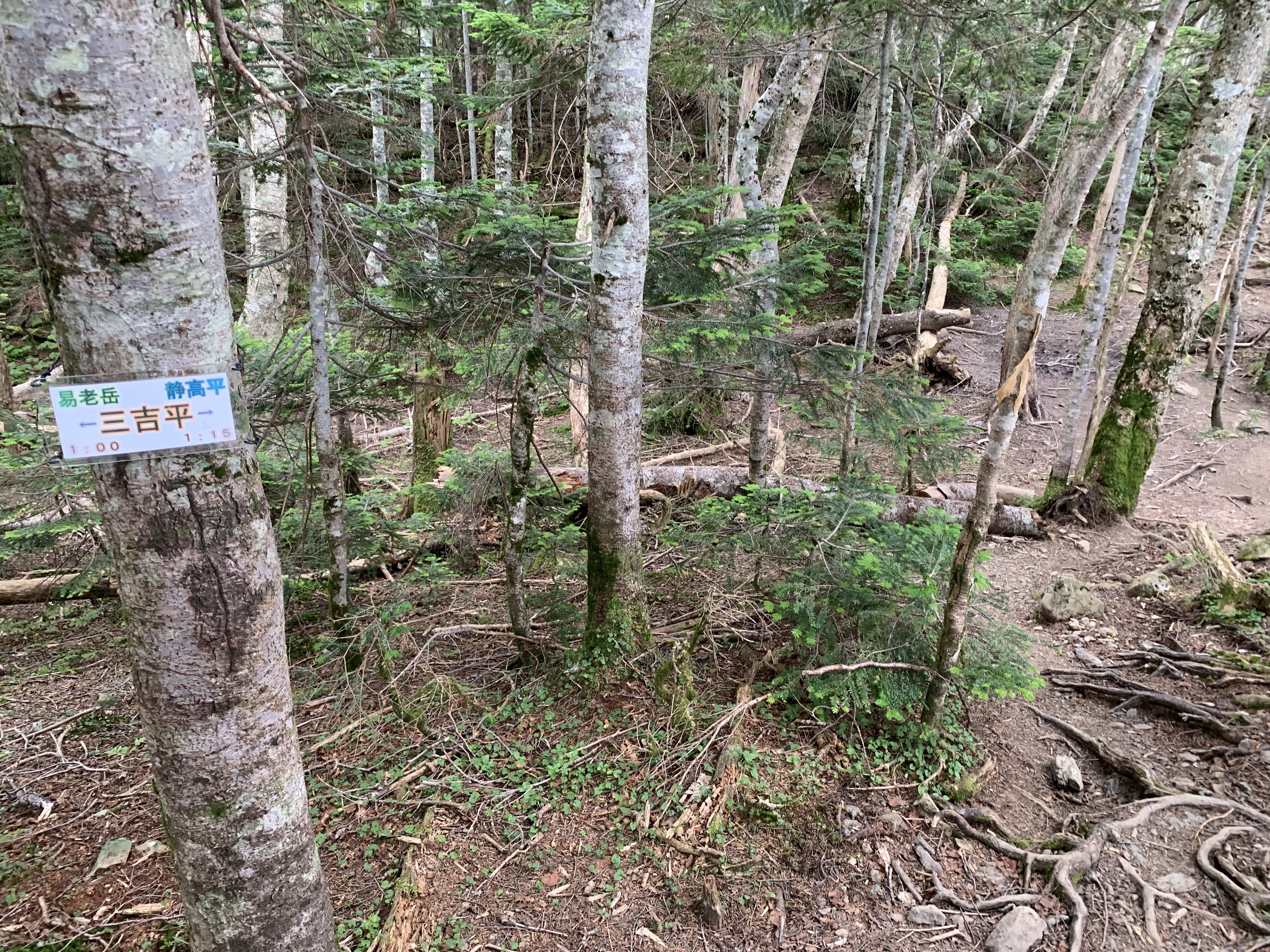 芝沢駐車場(5:31 1時間11分) ⇒ 易老岳、光岳登山口(6:42 39分) ⇒ 易老渡~面平⑤(7:21 1時間32分) ⇒ 面平(8:53 40分) ⇒ 面平~易老岳⑮(9:33 1時間5分) ⇒ 面平~易老岳⑳(10:38 1時間9分) ⇒ 面平~易老岳㉕(11:47 56分) ⇒ 易老岳(12:43-12:53 37分) ⇒ 三吉平(13:30 57分) ⇒ 静高平(14:27 11分) ⇒ イザルヶ岳分岐(14:38 11分) ⇒ 光岳山荘(14:49)