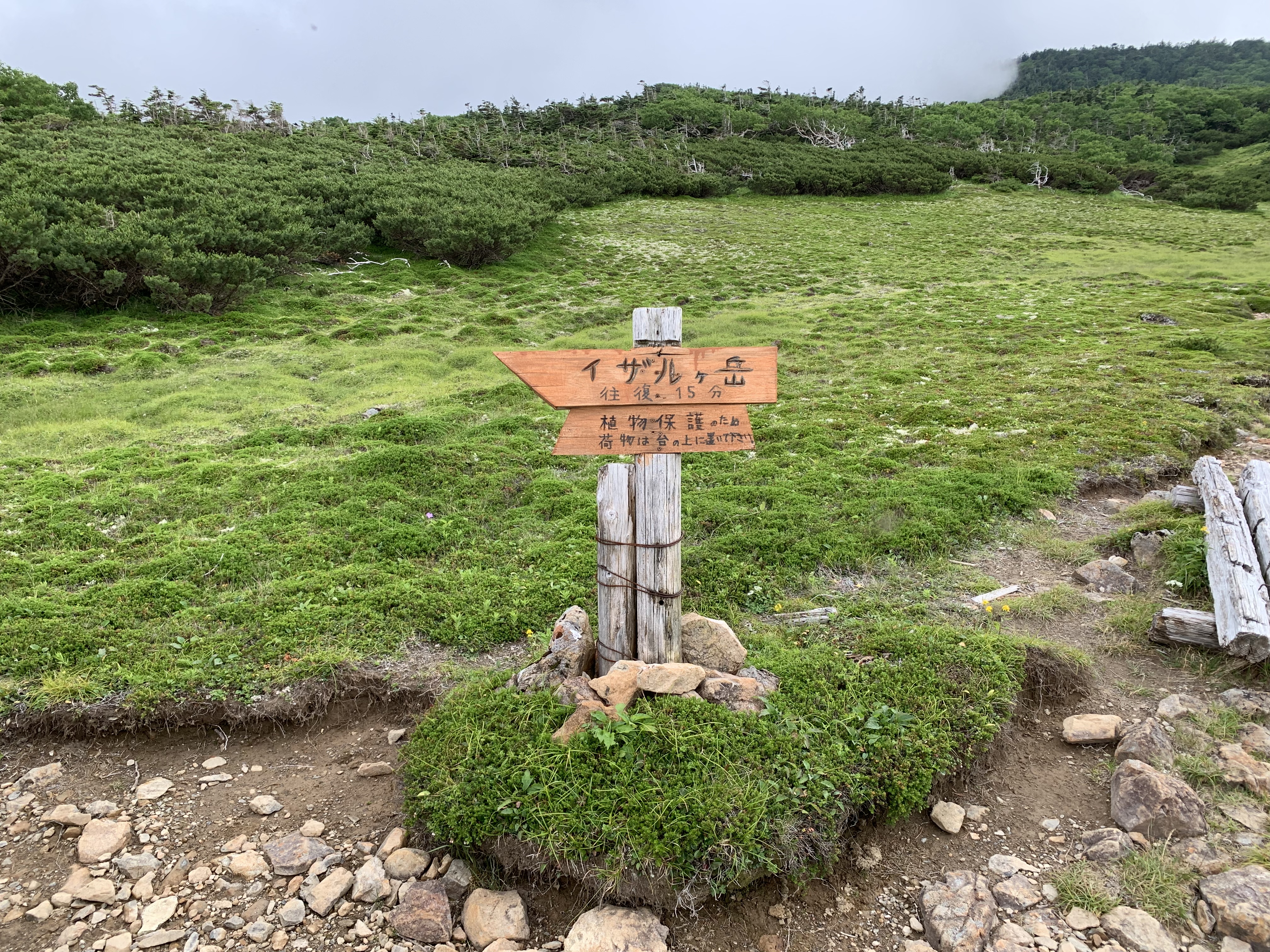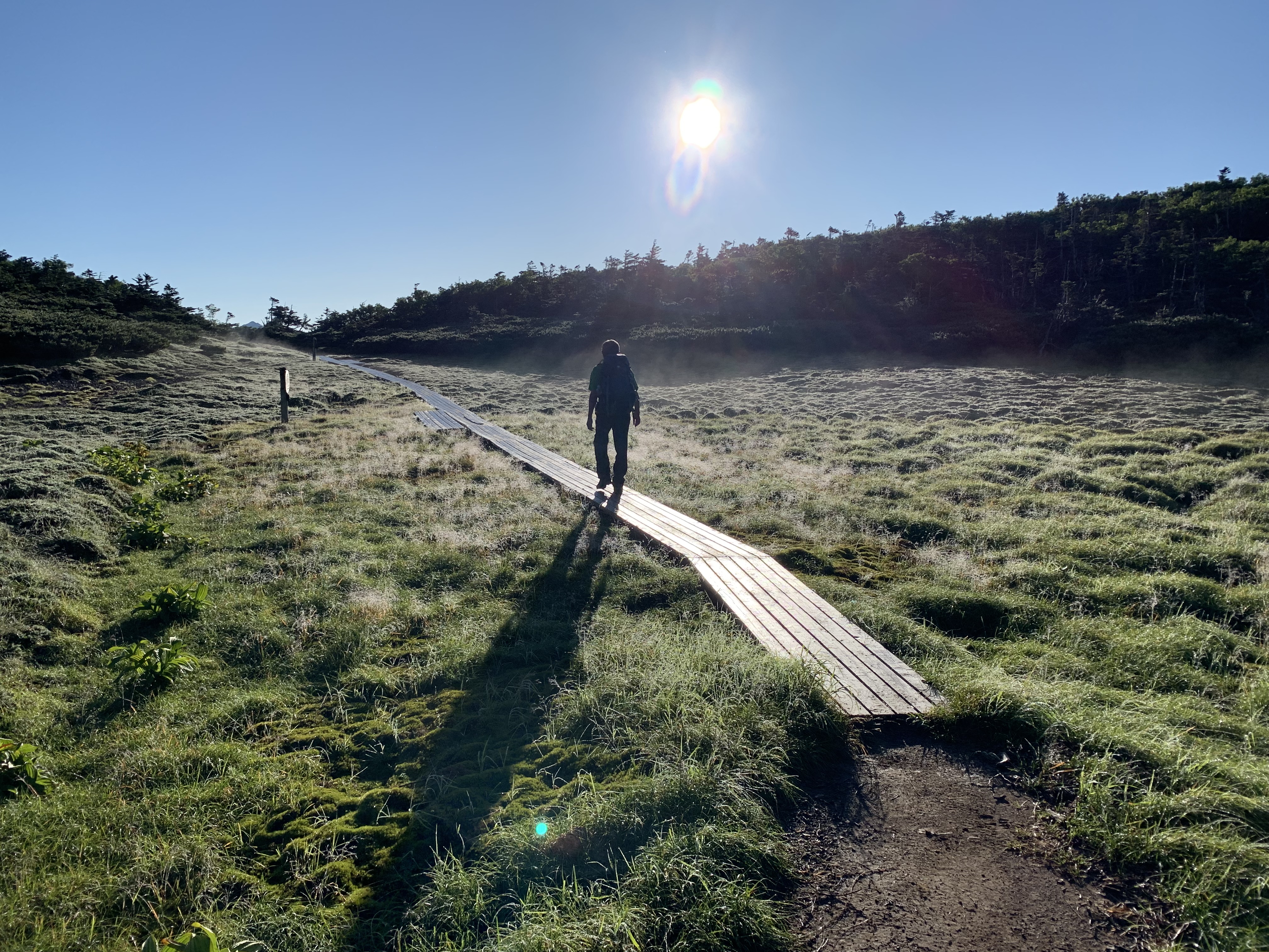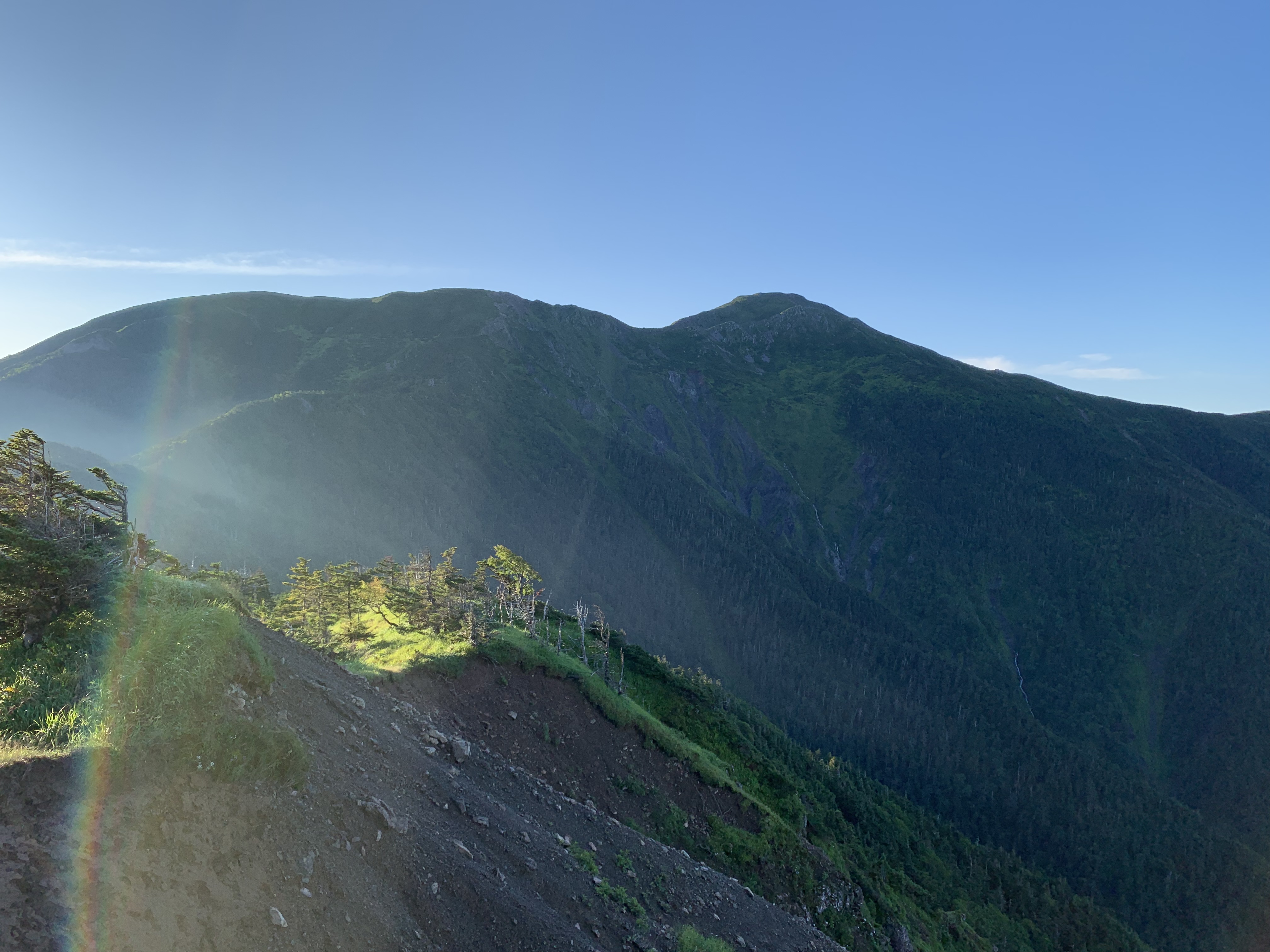 直ぐに、易老岳に向けて、昨日のコ-スを引返す。センジヶ原は朝日で朝露がひかり、幻想的な景観を醸しだしている。水場まで20分で一気に下り、水を補給する。ここでイザルヶ岳に寄るのを忘れたことに気づいたが、引返す気分になれなかった。静高平を抜け、昨日息を切らして上ったガレ場を快調に下る。三吉平へ1時間程で着く。ここからアップダウンのある登山道を、易老岳まで登って行く。最後の急坂を上ると、易老岳に達する。約2時間の所要時間で、先行き明るい。一息つくと、ストックしていた水を回収して、茶臼岳方向へ歩を進める。