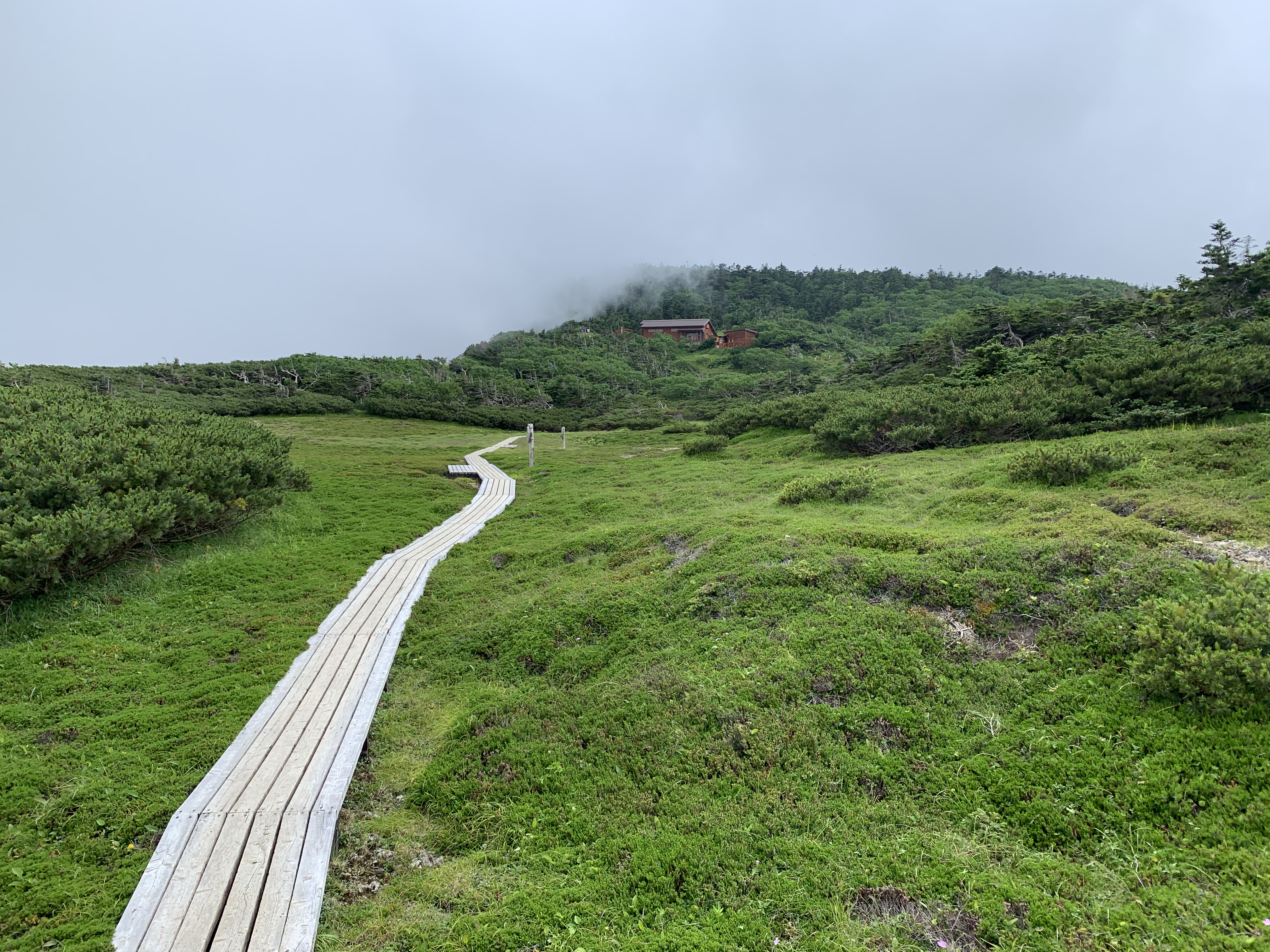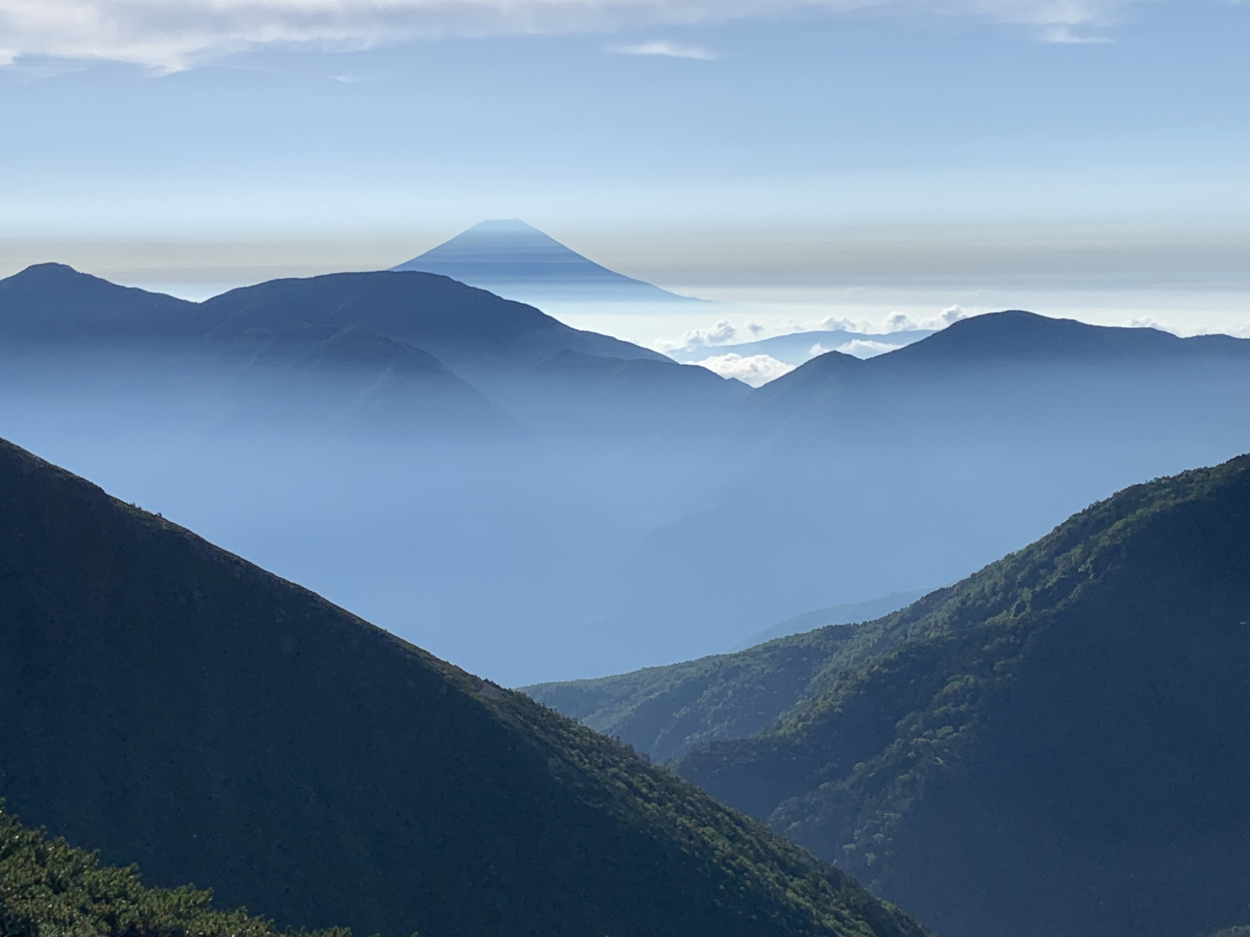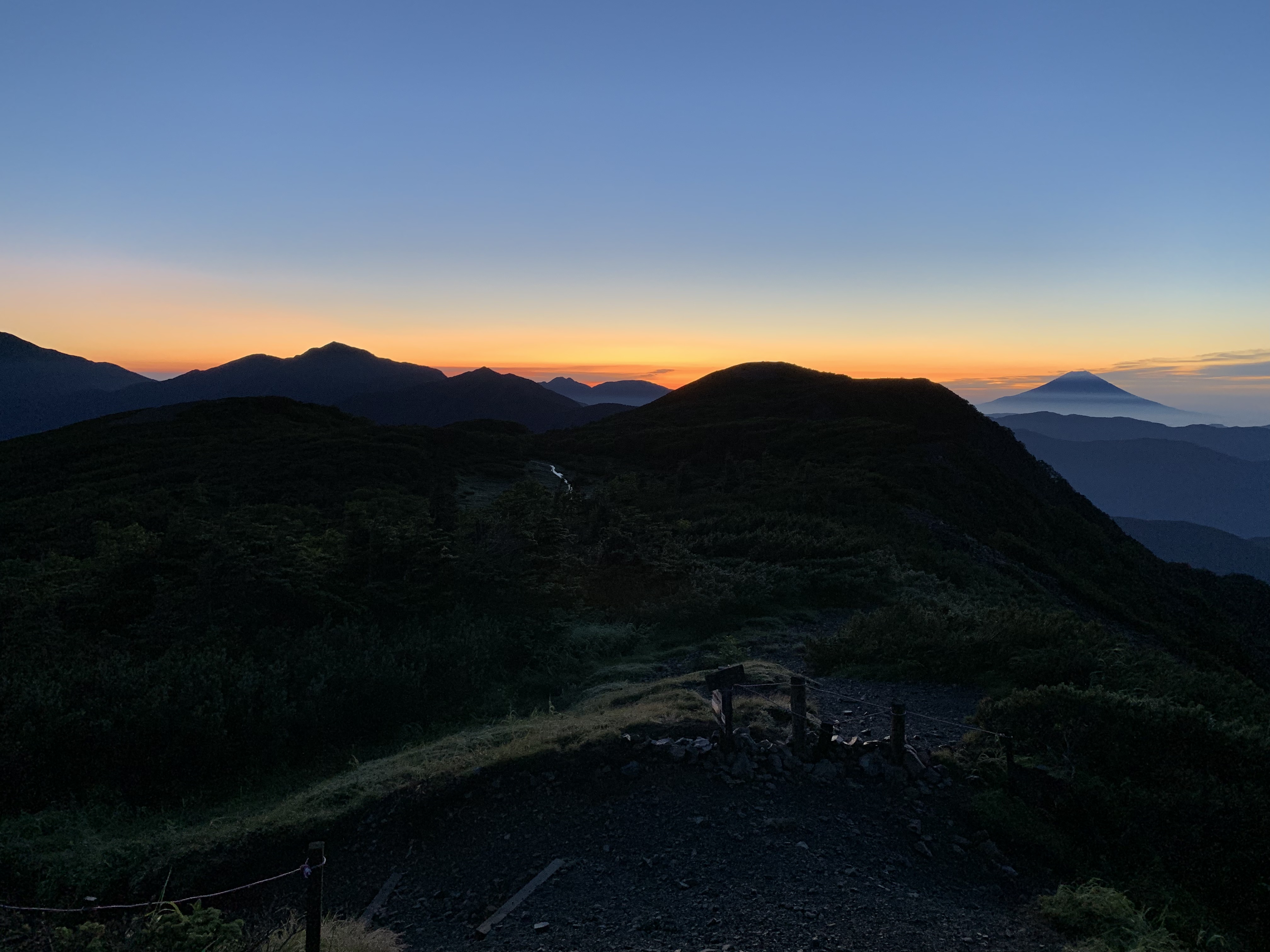 イザルヶ岳分岐を通り、センジヶ原の木道を速足で歩く。光岳小屋に14時49分に着く。易老岳から1時間56分で、何とか15時までに間に合った。早速宿泊手続きをし、一服する。小屋前の広場に出ると、富士山が霞んで見える。連れは16時20分頃到着する。暫くすると雨が降り出す。17時から夕食が始まり、西の空が赤みを帯びてきた。夕食は5人で、天婦羅だった。今日の宿泊は空いているが、明日は満杯の予約が入っているらしい。
