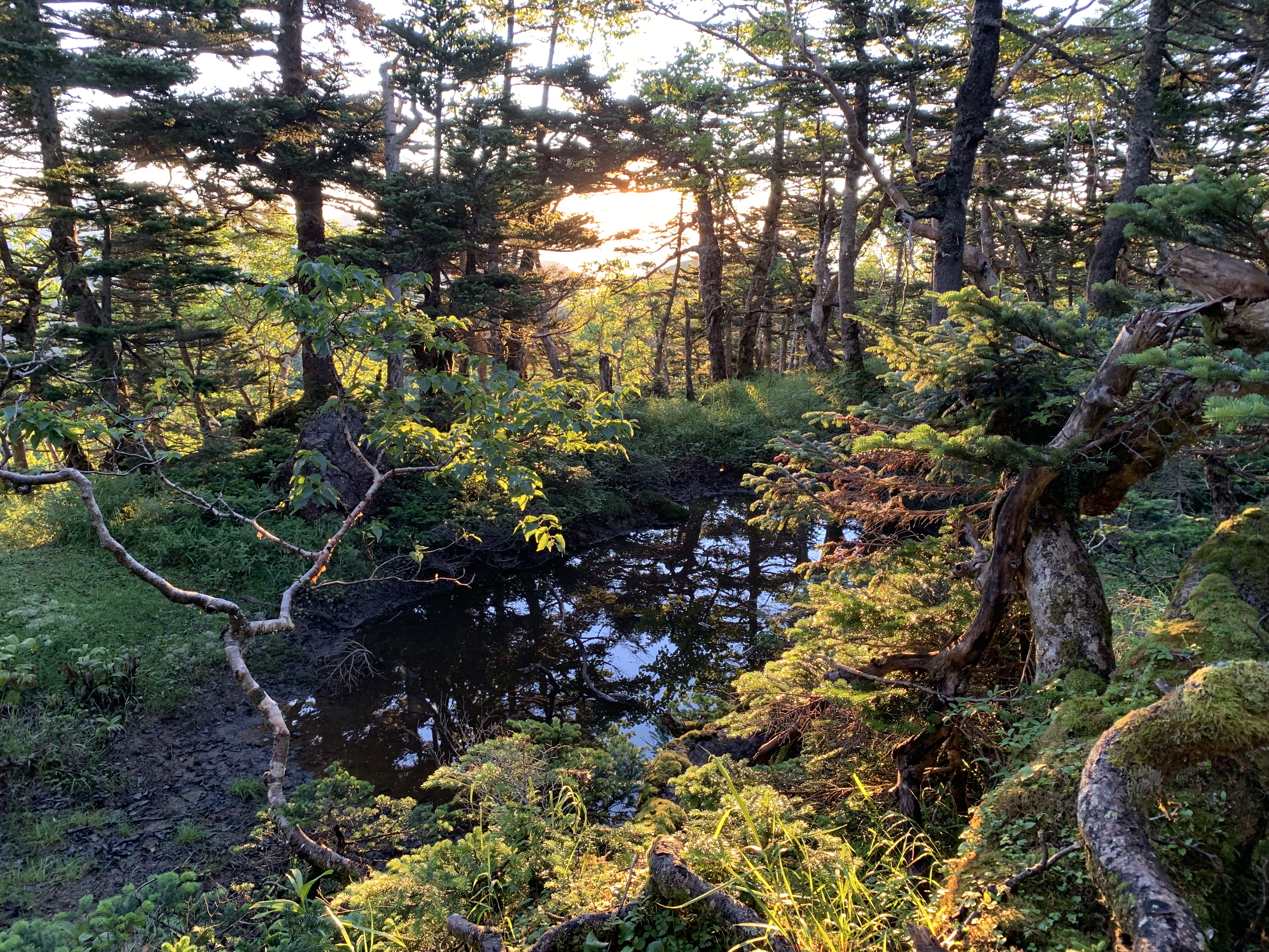 今日は聖平小屋まで長い縦走路を歩く。天気は登山日和だが、暑い1日が続きそうだ。朝食前に、小屋前の広場に朝焼けの富士山を見に行く。日の出直前の富士山と聖岳が赤をバックに影絵となっている。朝食は5時からだが、10分前から始まる。食事が終わると、空身で光岳を目指す。日出直後の時間帯だが、樹林帯なので全く見えない。しかし、木漏れ日で樹林が黄色く染まって美しい。光岳山頂(2,591m)に12分で着き、登頂写真を撮る。