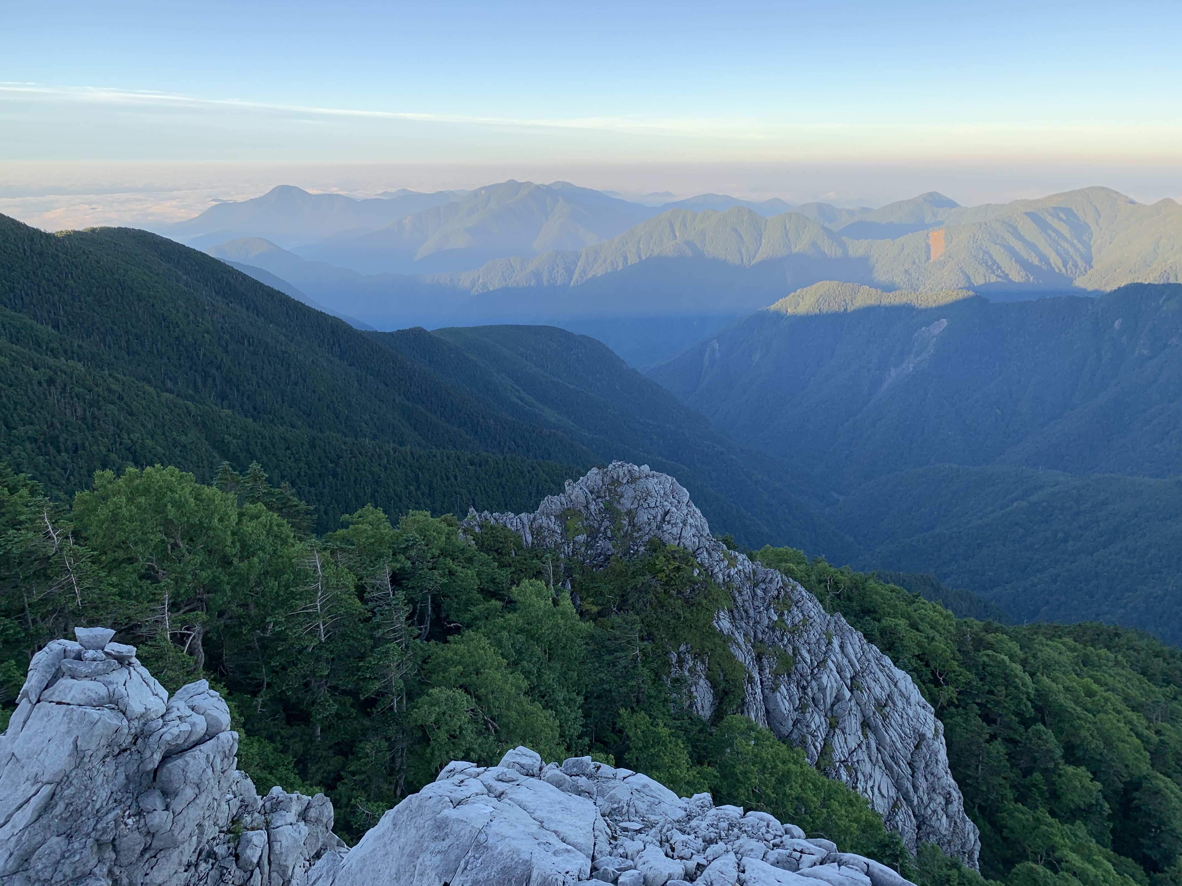 私一人で視界のある光岩まで下る。光岩から中央、北アルプスが澄み切った空気の先に明瞭に見える。遠く白山らしき山塊を認める。ここから見る光岳は樹林に覆われていることが一目瞭然だ。10分程光岩に留まり光岳山荘に引返す。