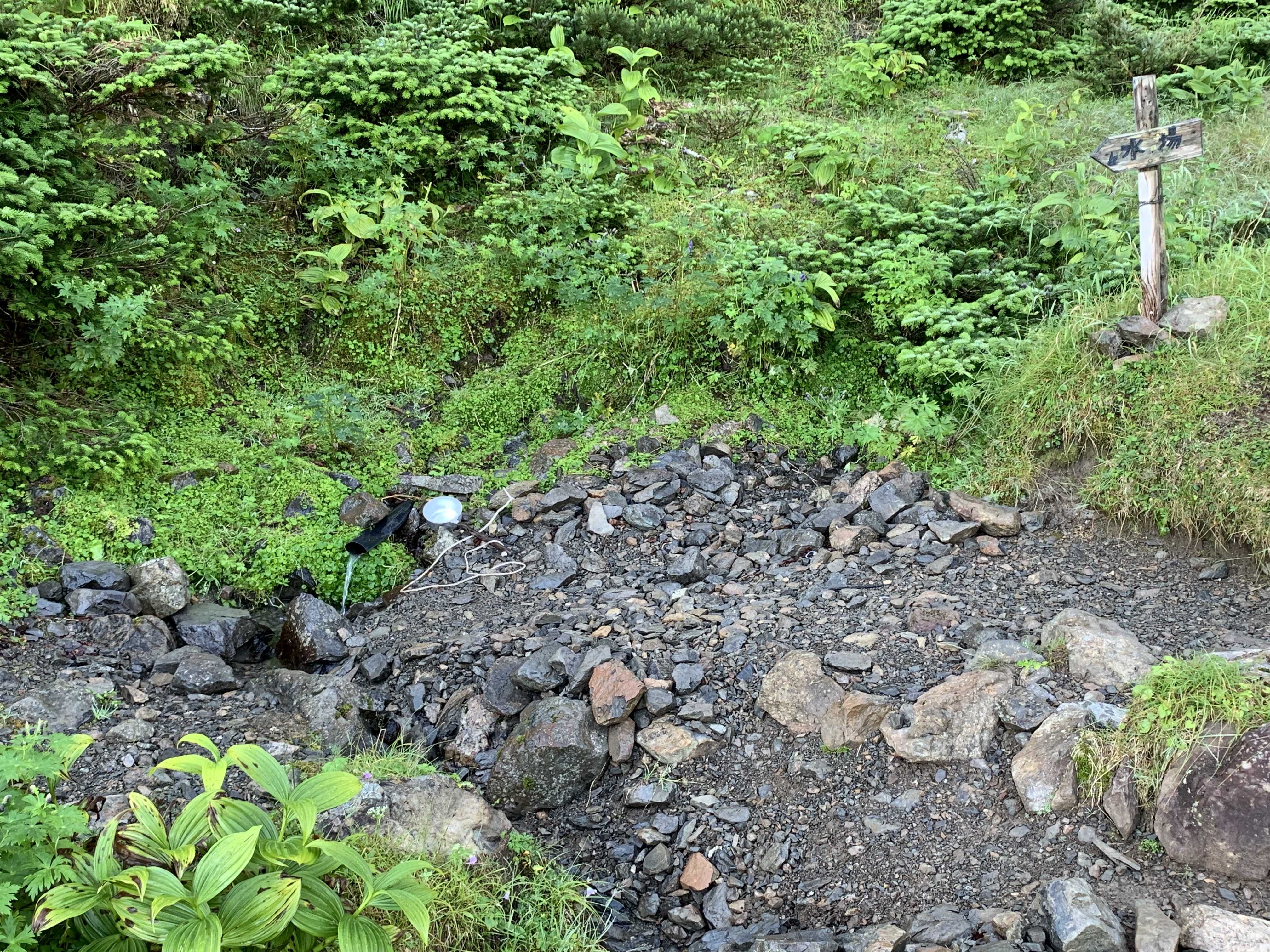 光岳小屋は15時までに着かないと、夕食を用意出来ないと聞いていたが、この調子では無理だと諦める。取敢えず、私が先行して行ける所まで頑張ることにする。荷物を軽くするため、一部の水をこの場所にストックする。三吉平にコ-ス時間の半分近くの37分で着いたので、可能性が見えてきた。暫く進むと、急坂の歩きにくいガレ場となり、体力を奪われる。そこを抜けると、静高平に着く。その一角に水場があり水の補給と頭から水をかける。暫く行くと光小屋の赤い屋根が視界に入る。