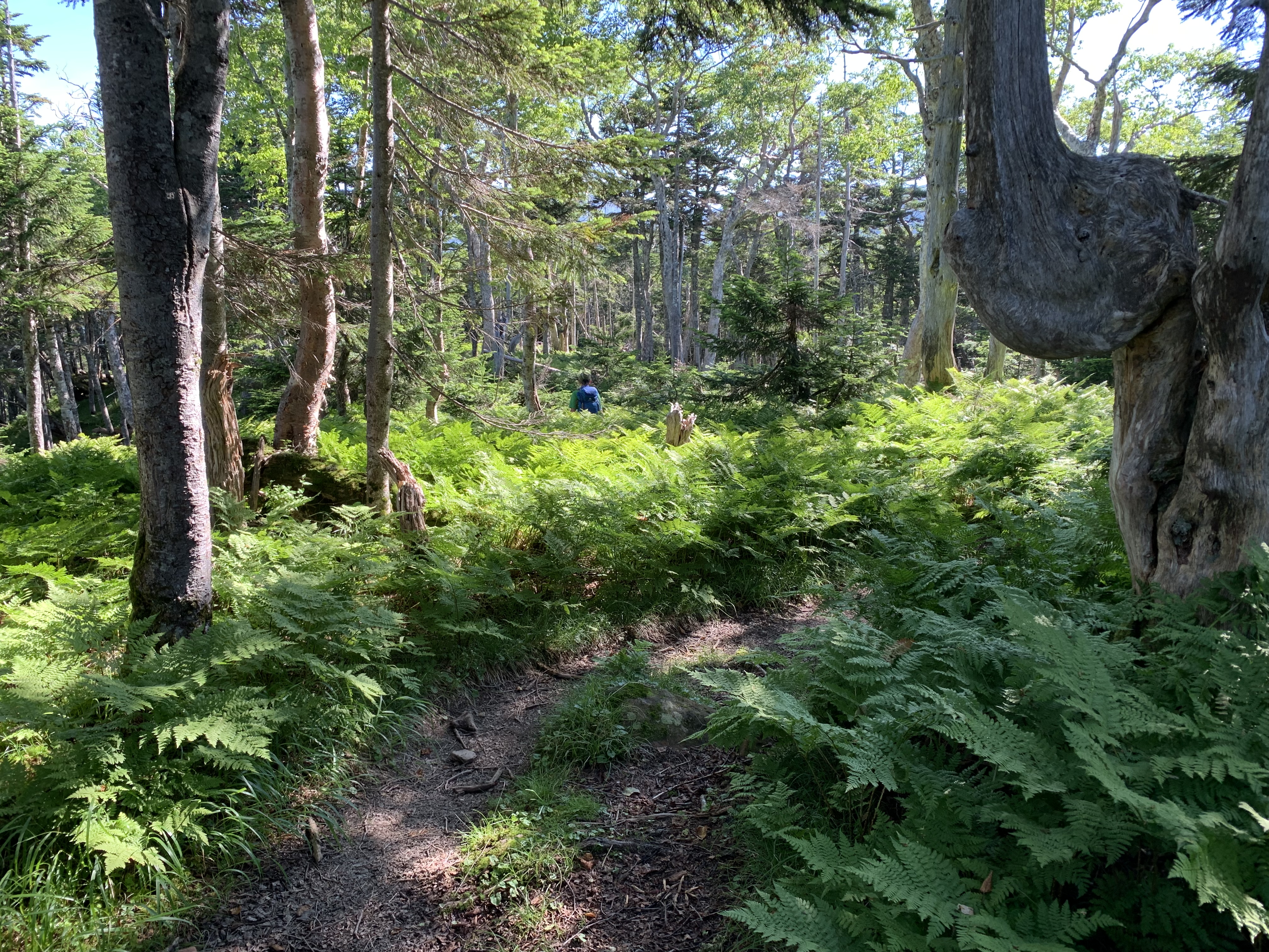 出始めはシダが群生しているシラビソの樹林帯を通る。比較的平坦なコ-スが続く。やがて仁田岳の上りにかかり、仁田岳分岐の希望峰に2時間足らずで着く。希望峰と茶臼岳鞍部の仁田池まで、低木帯でこれから歩く稜線が良く見える。木道を過ぎると、やがて仁田池に達する。
