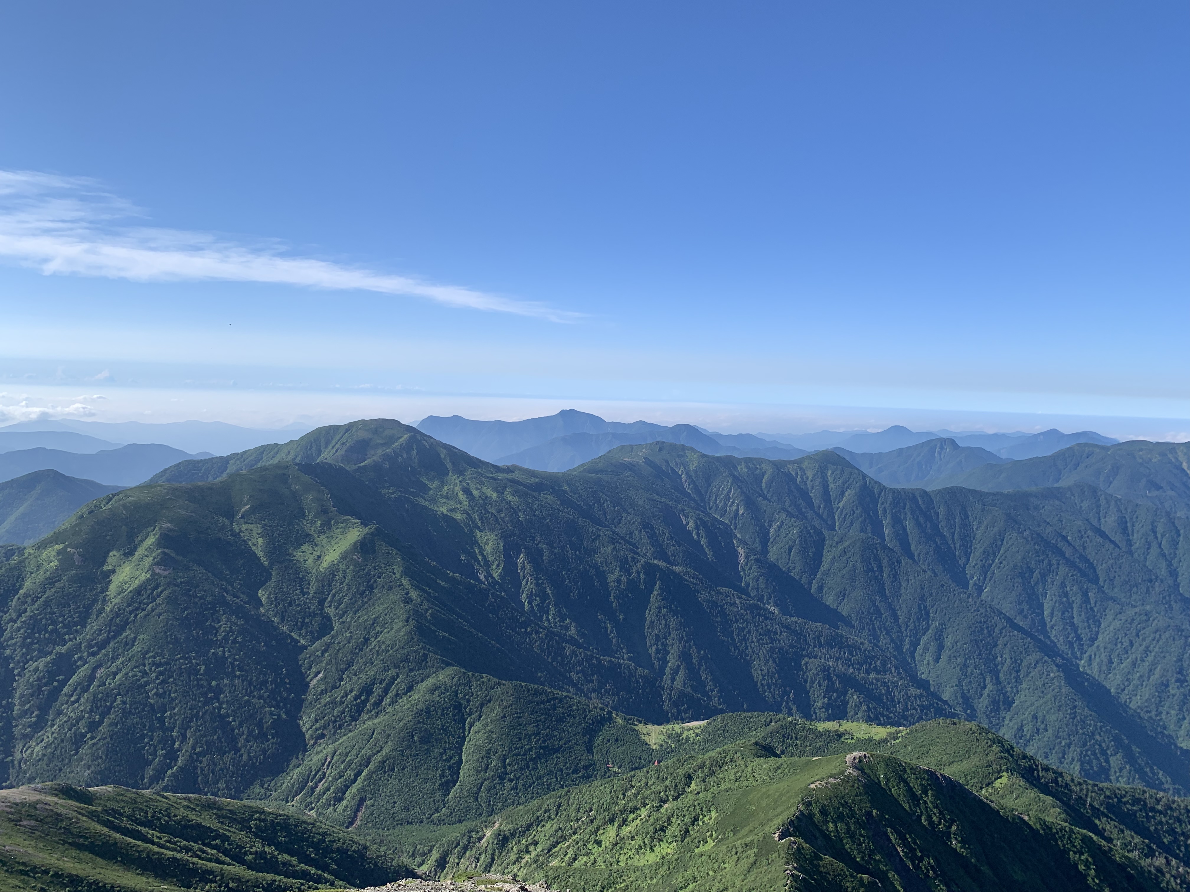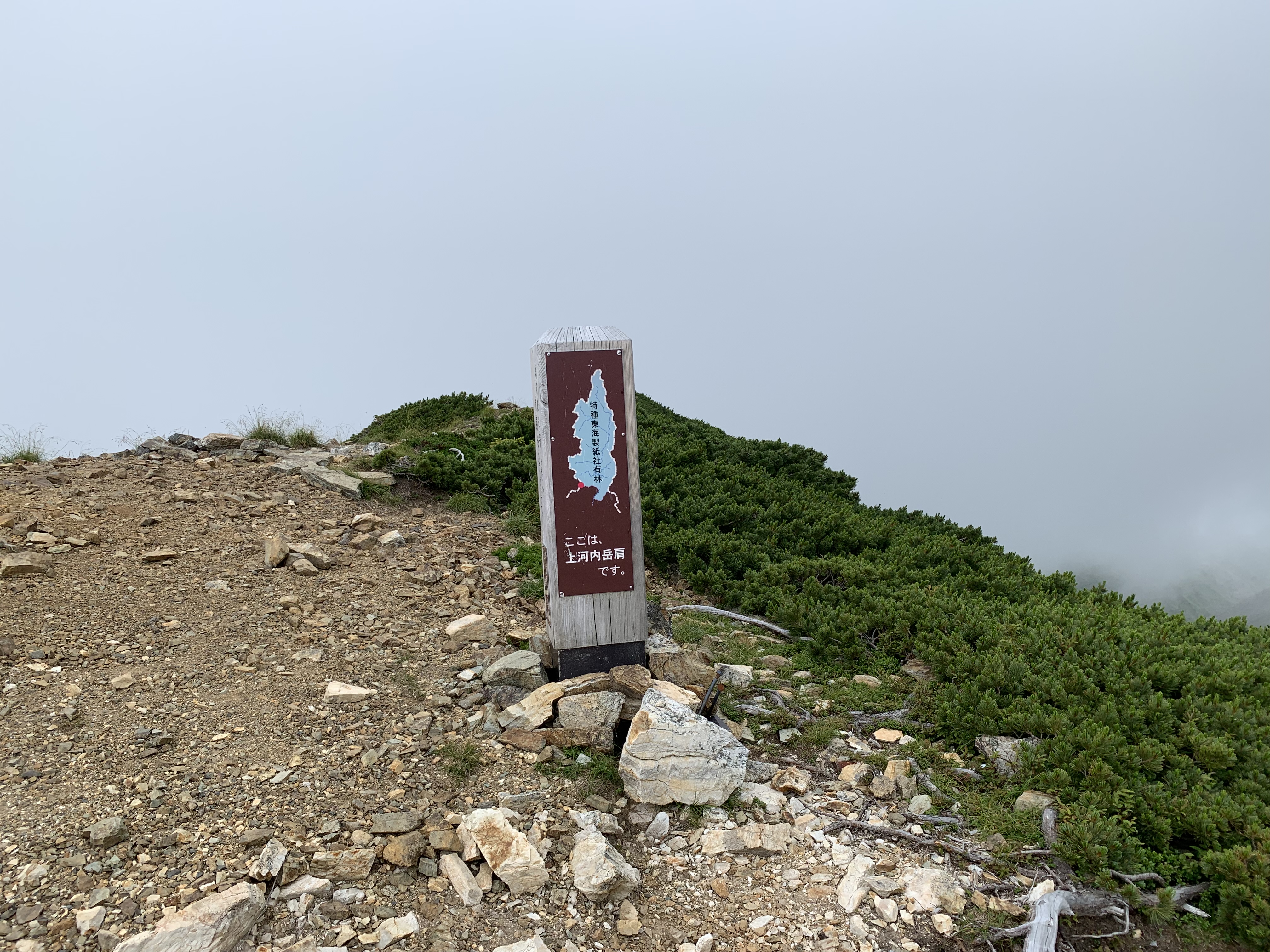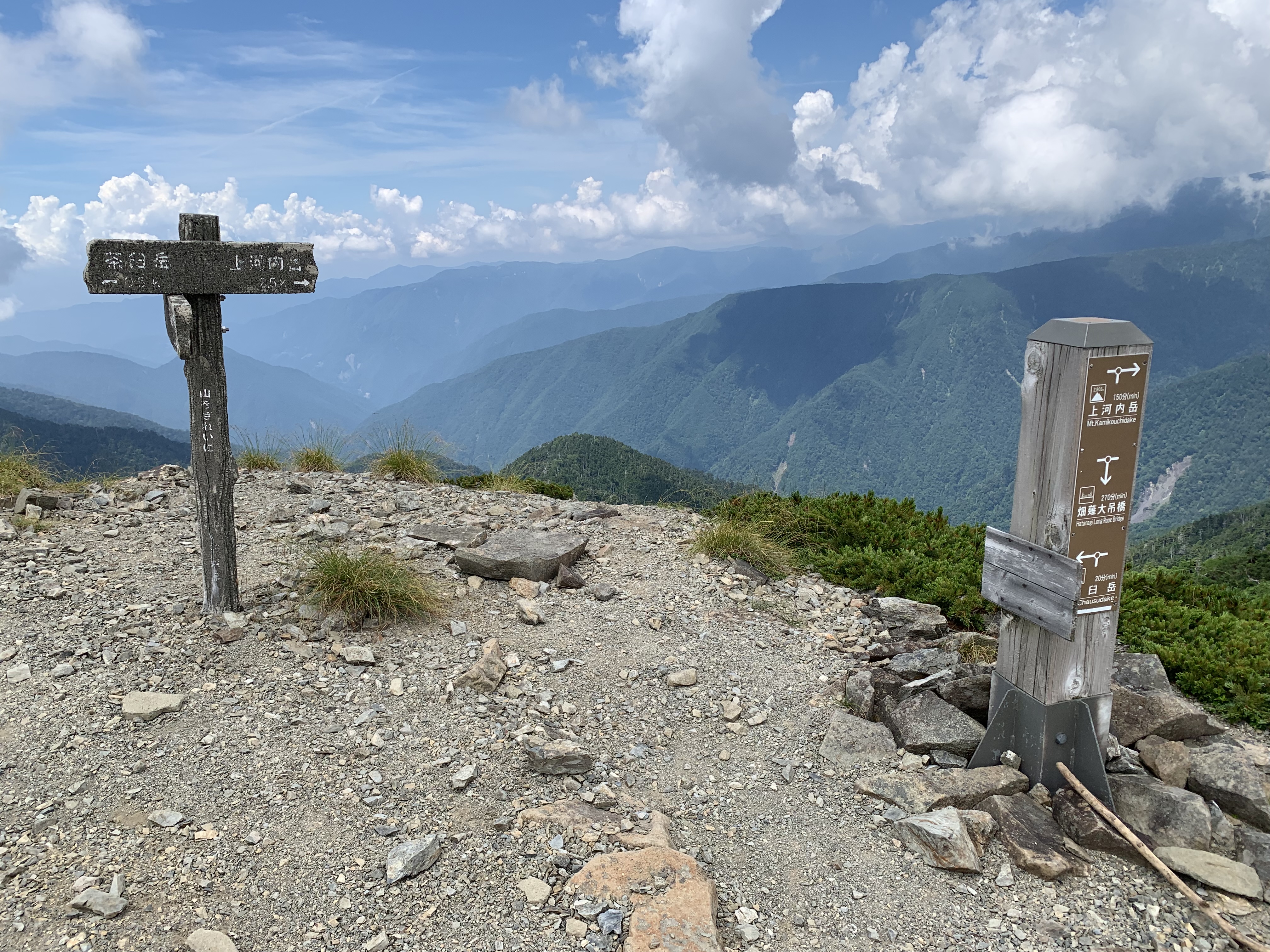 そこから山肌が見える登山道を歩き、岩山の茶臼岳に着く。茶臼岳から北方向の上河内岳に続く長い稜線に、気持ちを振出しに戻す。静岡県側から雲が湧き出したが、長野県側は良く見える。稜線は灌木帯で山肌が見えるので、気分的に楽だ。一旦茶臼小屋分岐まで少し下り、上河内岳に向かって進む。幾度か上河内岳を隠すピ-クを超え、岩稜の峡間を抜けると、上河内岳に続く急峻なジグザグなガレ場となる。上河内岳肩には茶臼岳から2時間強かかる。その間何人かに追越される。上河内岳山頂はガスっていたため、これ幸いに登頂することを断念する。聖平小屋に16時半頃に着かないと、山小屋の夕食にありつけないことも通過した一因だ。休むことなく先を急ぐが、かなり疲れの蓄積を感じる。少しガスがかかり始める。