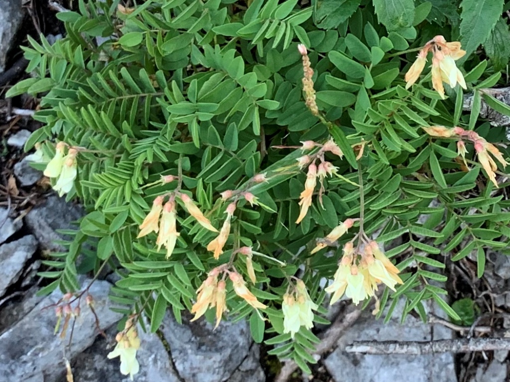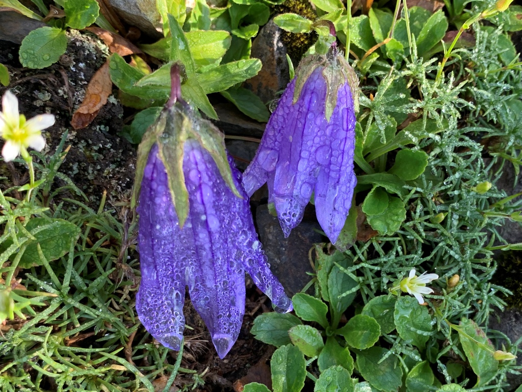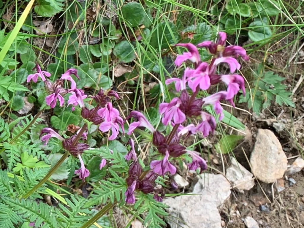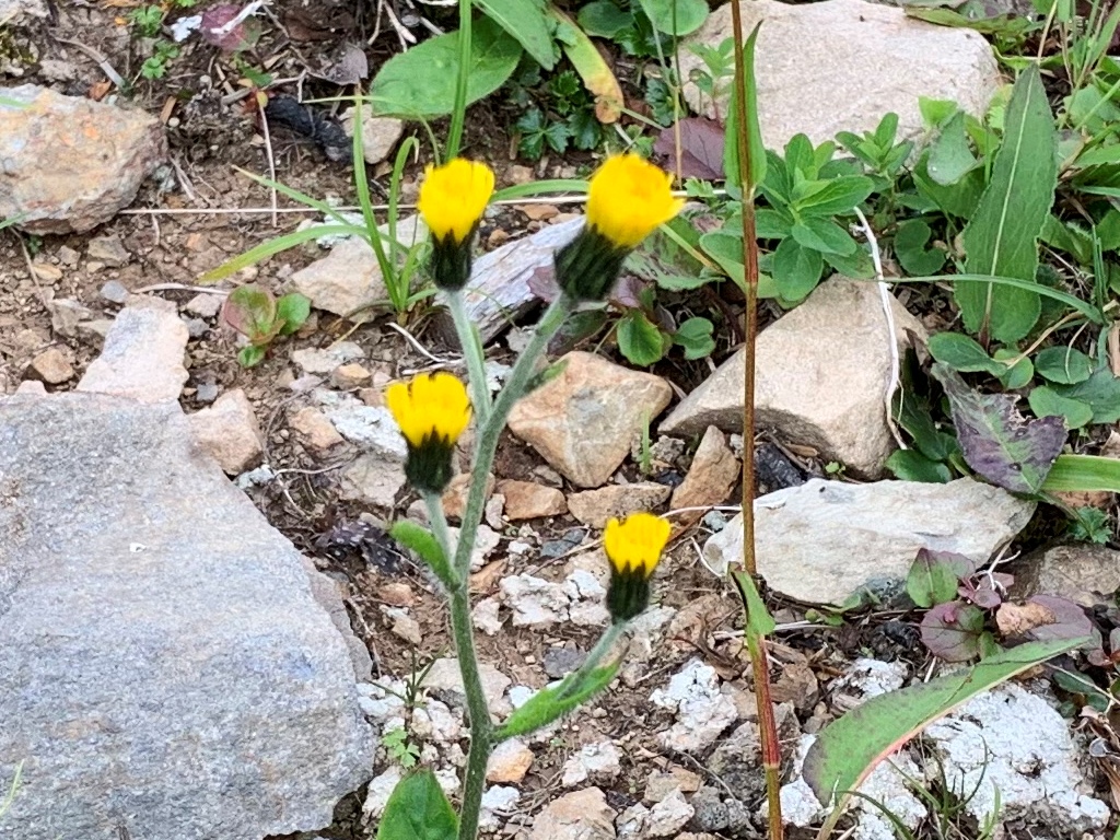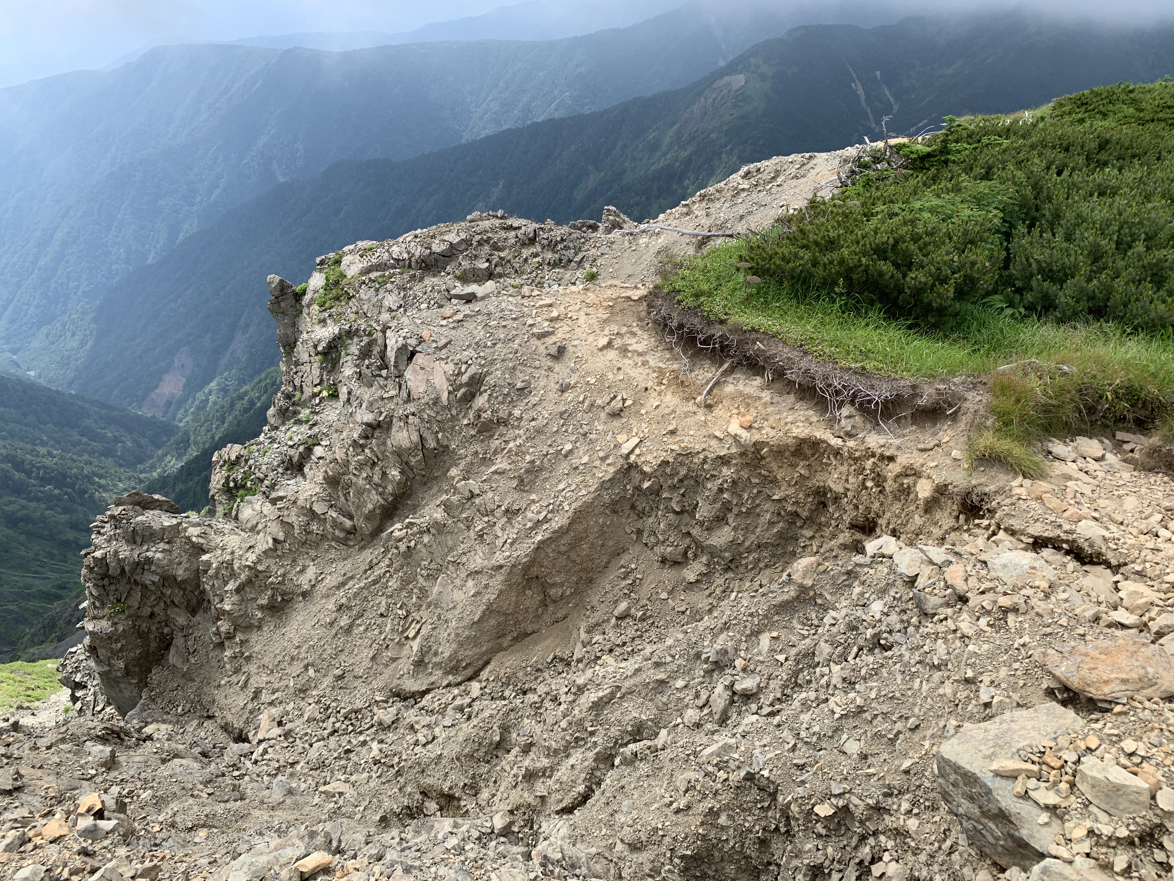 南岳までいくつかの小ピ-クを超える。崩壊が目立つ南岳直下付近に、高山植物の群落がある。今まであまり見なかったので、しばし写真撮影に時間を取る。南岳まで肩から33分要す。その先も左側の崩壊が目につく。稜線の遥か先に、聖平小屋の赤い屋根が見える。先が見えた気がして、疲れが緩和される。だが気持ちが先行して、なかなか小屋が近づかない。
