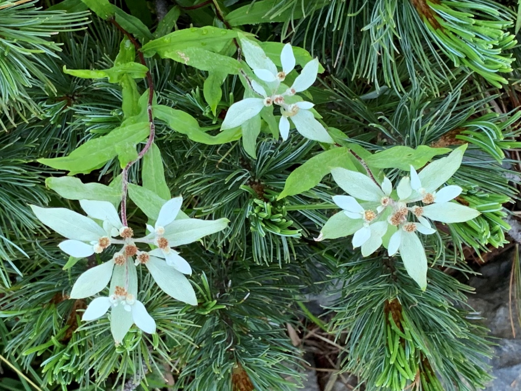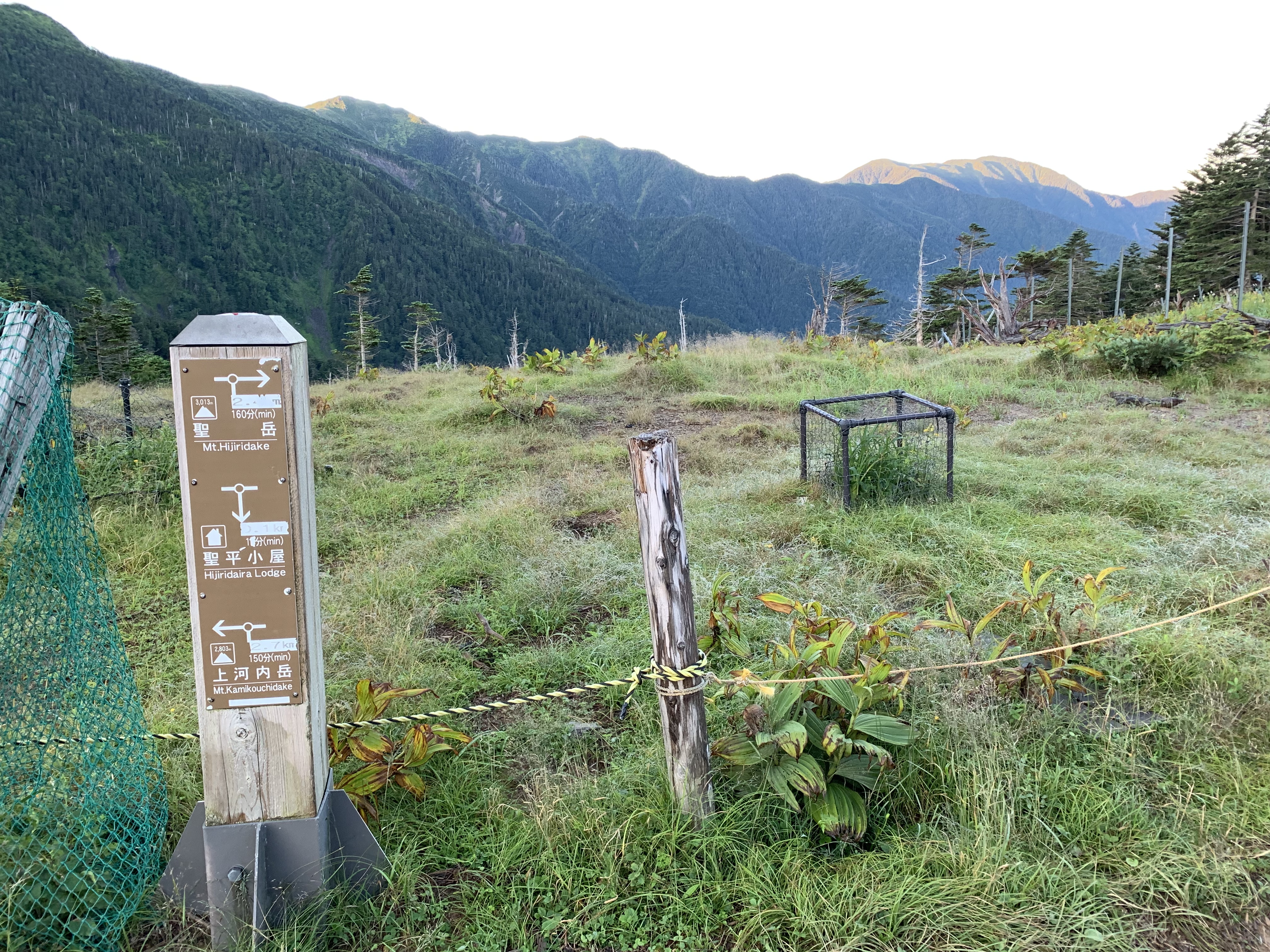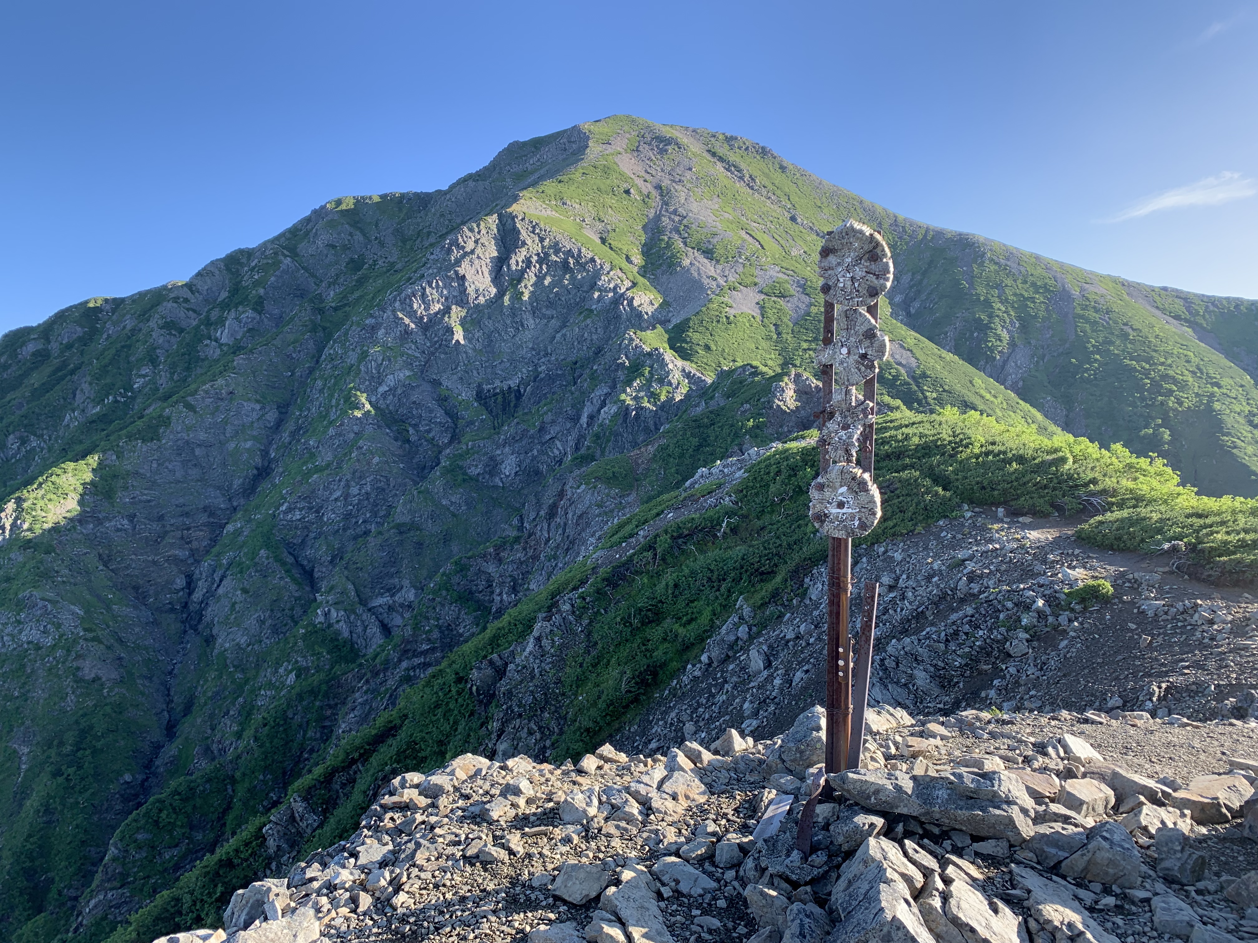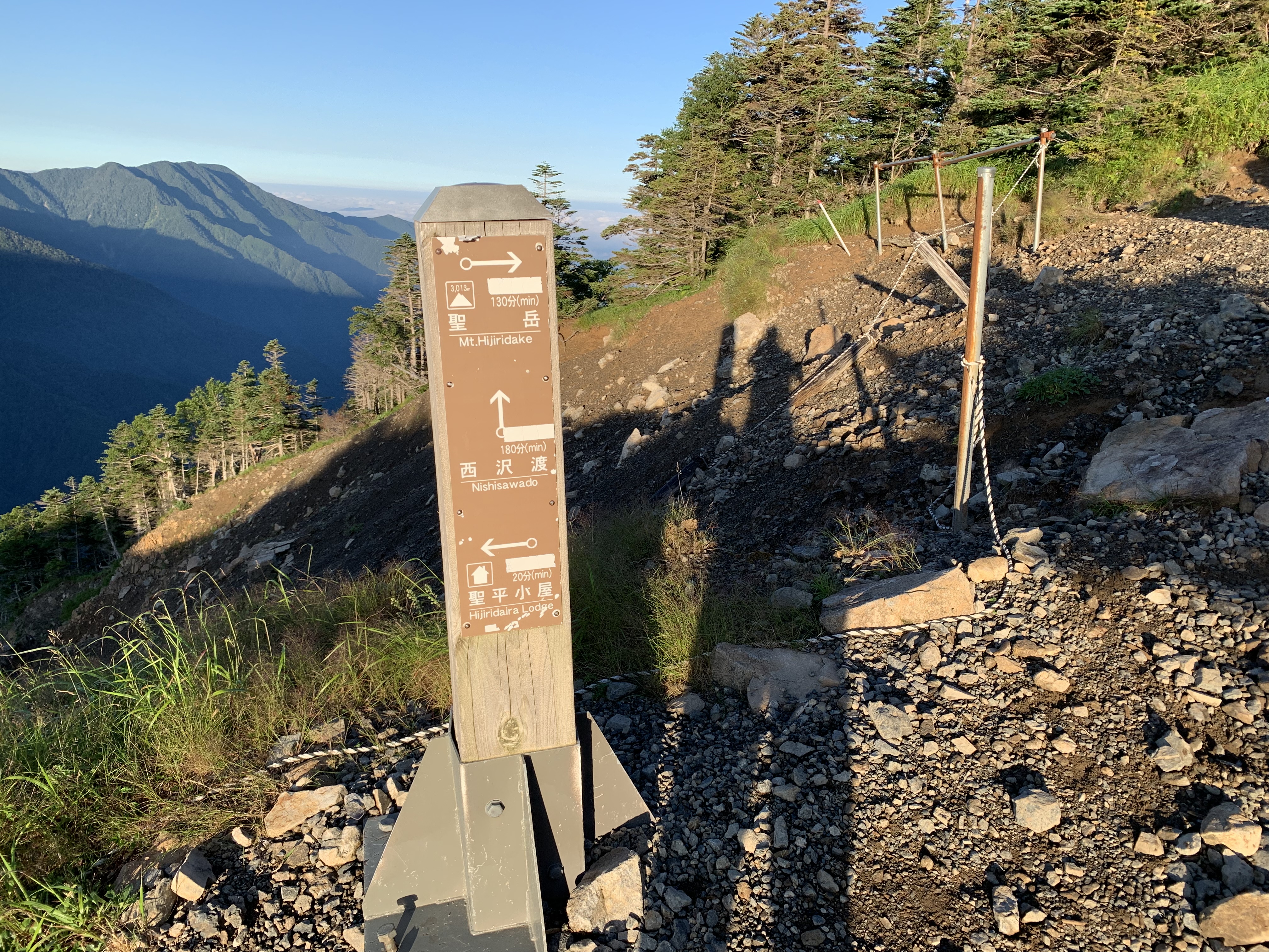 朝食を4時30分から頂き、聖平小屋を5時19分に出発する。木道を通り薊畑への登り口を5時22分に通過する。高山植物が点在する登山道を、23分上ると薊畑の分岐点に出る。そこから西沢渡に続く下山道と聖岳が一望出来る。そこに荷物をストックして、水と簡易食を持って登り始める。他にも多数のリュックが置いてあった。