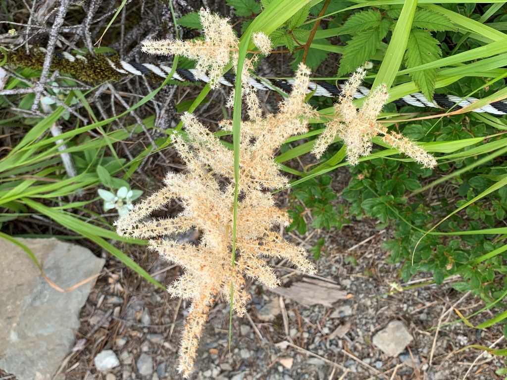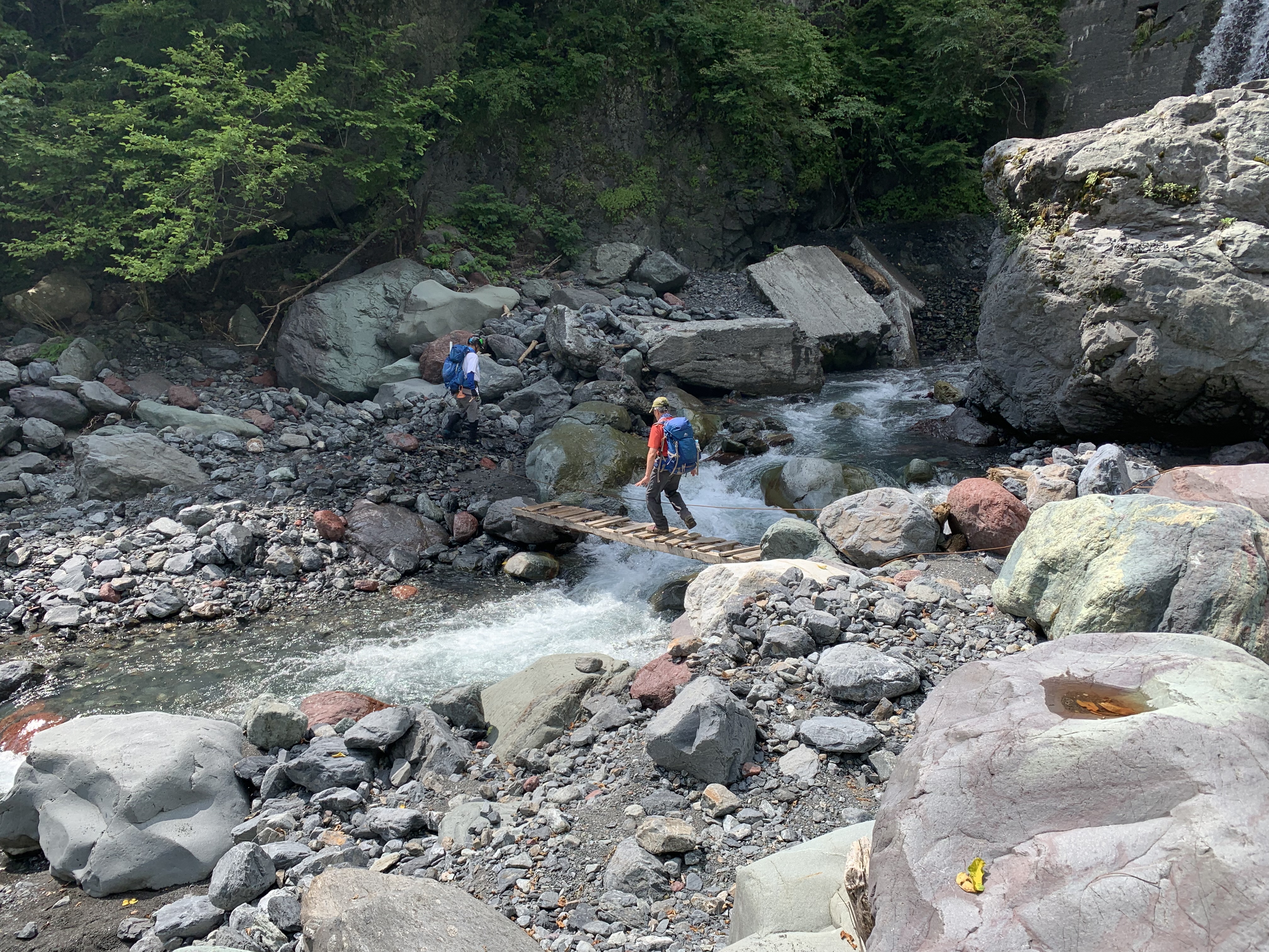 小聖岳から薊畑まで47分で下る。薊畑でストックしていたリュックを背負い、西沢渡まで標高差約1,400mの樹林帯をひたすら下る。カラマツ林の中を倒木が目立つ標高2,200mの標識を過ぎると、やがて苔平に着く。ここまで薊畑から1時間21分を要する。明らかにペ-スダウンしている。さらに15分程行くと標高2,000m地点を通過する。そこから同じような単調な下りが続き、気持ちが萎えてくる。標高1,800mまで下がると、次第に狭い登山道となり、左側に落下防止のネットが目立つ。沢の音が徐々に大きくなるのを励みに、ひたすら思い足を前に運ぶ。造林小屋跡が見え、西沢渡が近いことを知りほっとする。西沢渡に13時57分に到着し、苔平から2時間40分の苦行となる。西沢渡では釣りに訪れている人を見かける。