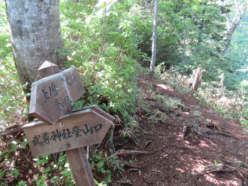 一昨日の日光白根山、昨日の皇海山に続き、友達との二人登山です。昨晩雨が降ったので、今日の天気次第で中止することも考えていた。ところが素晴らしい天気となり、予定通り武尊山に登ることにする。登山ル-トは例によって最短コ-スを選択する。裏見ノ滝駐車場で登山届けを投函し、5時48分に出発する。武尊神社から舗装されていない林道を歩く。林道にゲ-トが有る所まで29分を要する。そこに大きな駐車所があり、何か損をした気分になる。気を取り直して、さらに林道を進み、剣ヶ峰・武尊山分岐に着く。