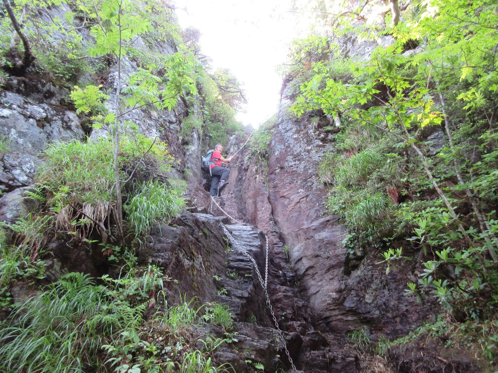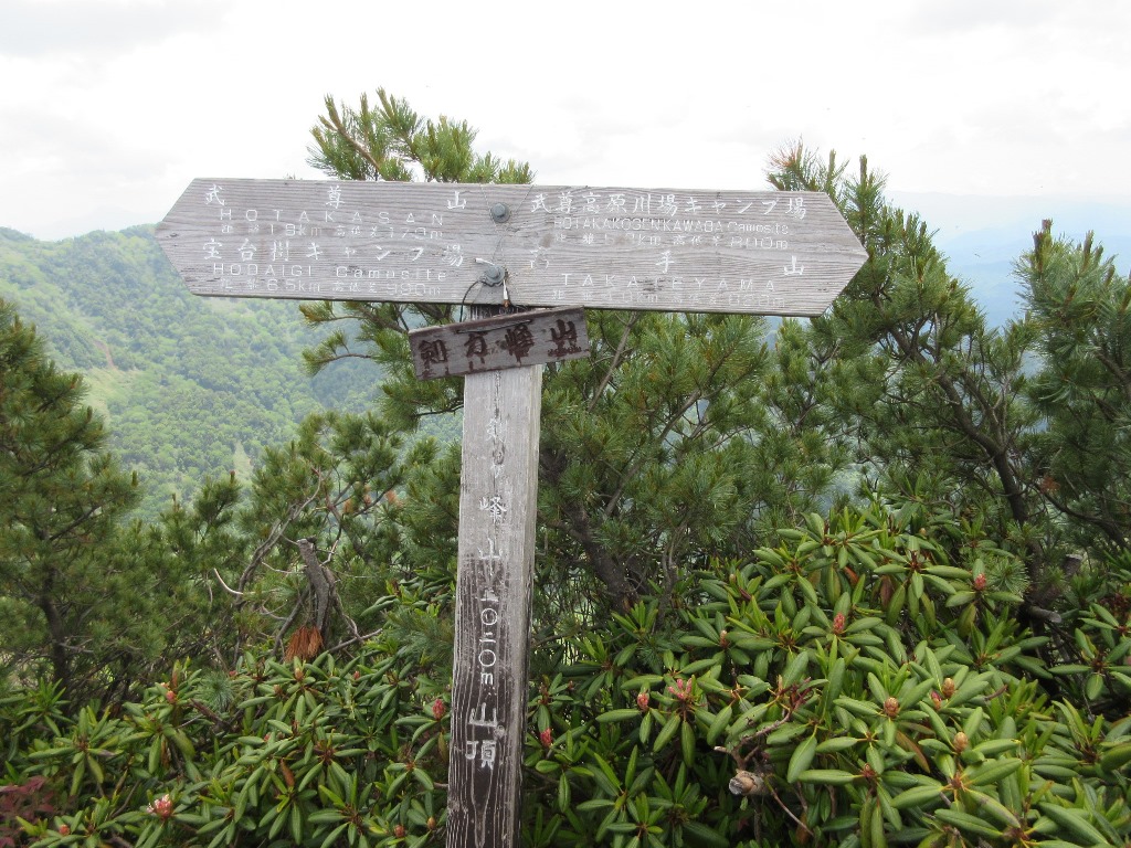 直進方向は復路のル-トで、そこを左折して手小屋沢避難小屋方向に向かう。最初は広い歩き易い登山道だったが、徐々に狭くなる。40分程歩くと急坂になり、ペ-スが大幅にダウンする。急坂を20分程上ると、上ノ原登山口との合流点手小屋沢避難小屋に出る。右方向に10分程進むと、手小屋沢避難小屋分岐で、左下にその小屋がある。しばらくなだらかな尾根道を進むと、長い鎖場のある行者ころげに行き着く。昨夜の雨で滑りやすく、時間がかかる。30分程鎖場と格闘し、そこを抜けると正面に武尊山を望める場所に着く。山頂を見ながら、しばし歩くと程なく山頂に着く。ここまで3時間22分の山行です。