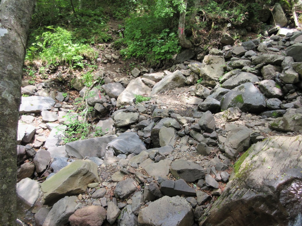 25分程山頂で留まり、下山は剣ヶ峰山方向に進む。剣ヶ峰山までの登山路を目の前で一望出来る。歩き始めた途端、平べったい石が敷き詰められて、急坂なので左右の低木を掴みながら下ることになる。石楠花の群落、熊笹を多く見かける。アップダウンを繰り返し、54分で剣ヶ峰山分岐に辿り着く。私のみ剣ヶ峰山(2,020m)を9分で往復する。そこからの下りが大変だった。急坂の大岩と根っこに悩まされる。しかも昨夜の雨で非常に滑り易く、気をつけていても何度か足をとられる。武尊沢に出るまでこの状態が続く。武尊沢を超えると、ようやく歩き易い登山道となる。30分程歩き、丸太の橋を渡ると林道となる。さらに進むと、往路の分岐点剣ヶ峰・武尊山分岐に着く。林道を速足でゲ-トまで来ると、駐車場に2台停車していた。そこから更に24分を要して、裏見ノ滝駐車場に着く。ゲ-トまでの未舗装道路は比較的良く、車で行くと小一時間助かる。但し、自己責任です。結局、復路は3時間43分かかった。