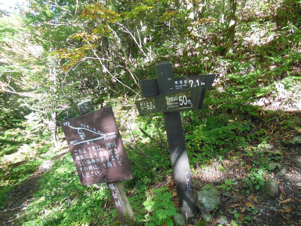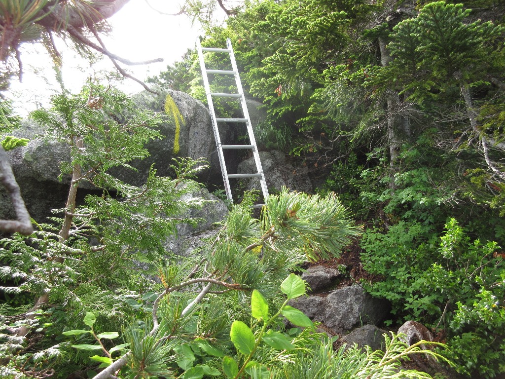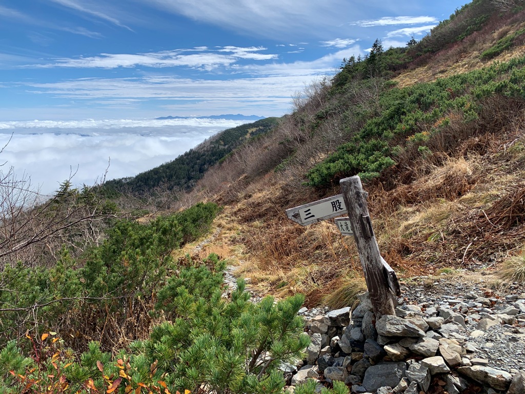 駐車場(8:23 11分) ⇒ 三股登山口(8:34-8:43 3時間16分) ⇒ 岩場取りつき梯子(11:59 1時間13分) ⇒ 避難小屋(13:12 5分) ⇒