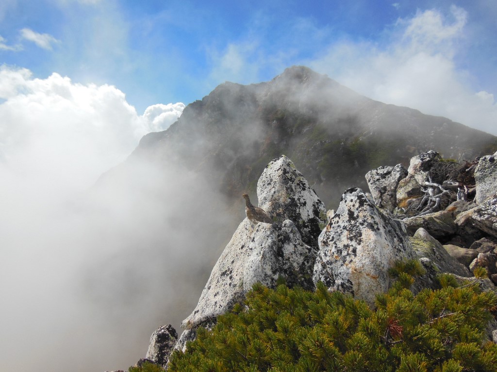 駐車場を7時出発、三股登山口を7時15分、そこから50m程行ったところの蝶ヶ岳との分岐地点で、常念岳まで7.1Kmの案内板を見て通過する。登山道は急勾配の連続で、そこを登り詰めるとフラットな尾根を経由して、大きな岩場に達した。そこまでの樹林帯では、ときおり鮮やかな紅葉が見られた。前常念、常念岳までは岩場の連続で、結構体力を消耗した。特に私は、白馬岳、雨飾山で足をつったのがトラウマとなり、同行者の足を引っ張ってしまった。途中、常念岳を背景にする形で、岩の上に雷鳥を見つけた。デジカメの格好の被写体となった。結局常念岳山頂(2,857m)には、13時15分の到着で6時間15分もかかってしまった。山頂から、下界は雲海で覆われ、その上に八ヶ岳、富士山、南アルプスが顔を覗かせていた。槍穂はガスで全容を見え隠れしていた。到着が遅くなったので、昼食を早々に済ませ、14時出発する。その間に蝶ヶ岳側からスエーデン人のカップルが来たのには驚いた。
