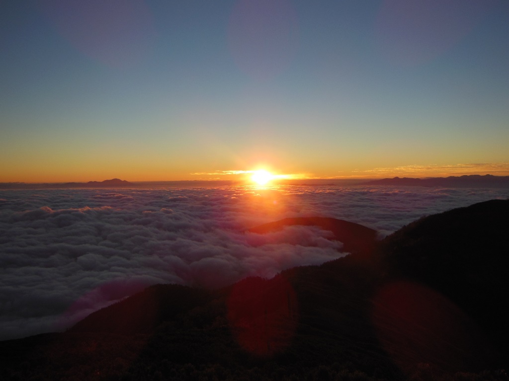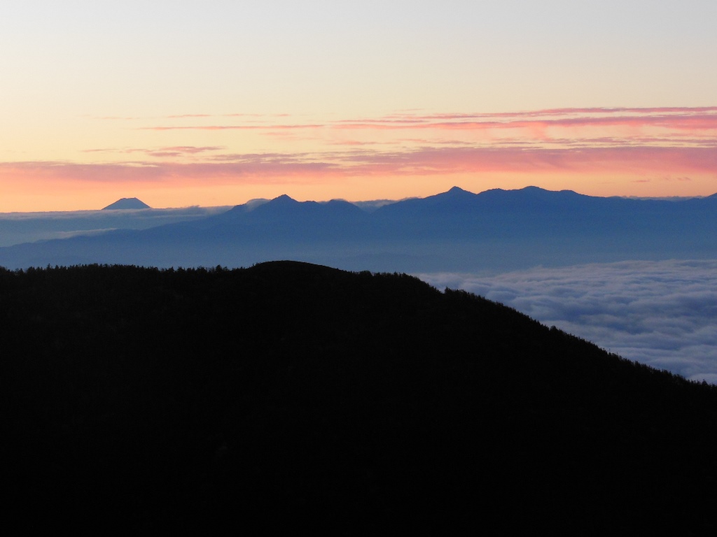 5時過ぎ頃に、泊り客の騒音で目が覚めた。ご来光を見るために瞑想ノ丘まで出かける。微風で非常に暖かい夜明けだった。東方向は雲海で覆われていた。富士山は山頂部分が鮮明に望めた。槍、穂高は手に取るように、眼前に勇壮な姿を現し、槍、北穂高、穂高山荘の灯りを認めた。なかなか日が明けないので、娘等を起こして山頂に向かう。蝶ヶ岳山頂(2,677m)は大勢の登山者が既に登っていて、ご来光を待っていた。やがて南アルプスの左から、雲海の上に朝焼けとともに真っ赤な姿を徐々に拡大した。またたくうちに全容を覗かせ、山々を白日の元に晒した。槍、穂高の山塊も、急速に常念岳尾根の影を山頂から谷に消していった。