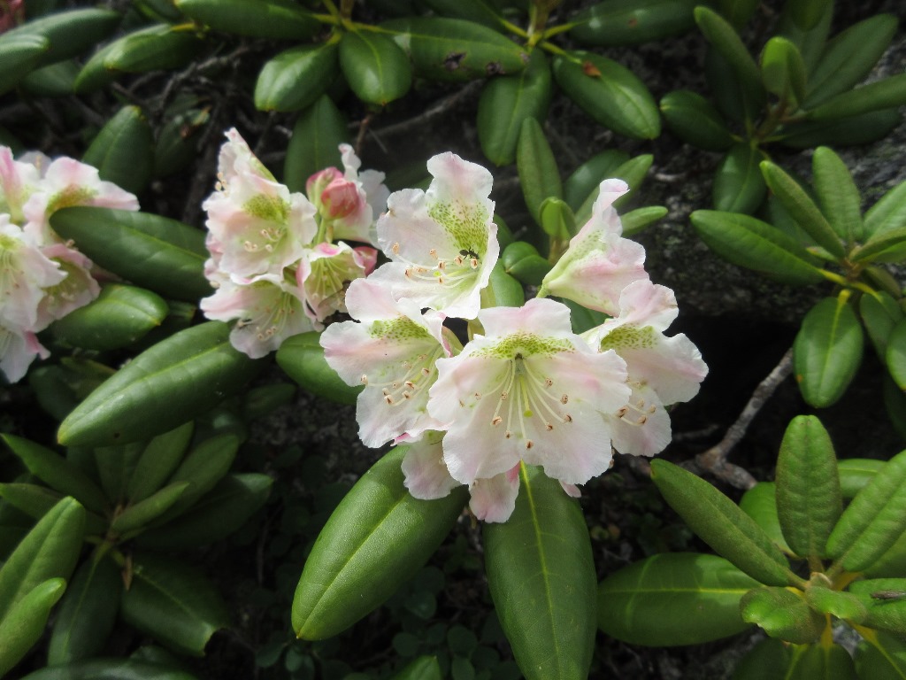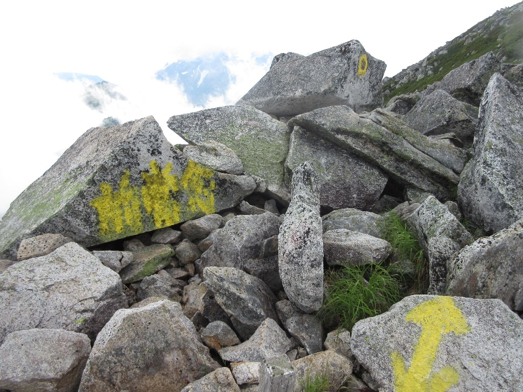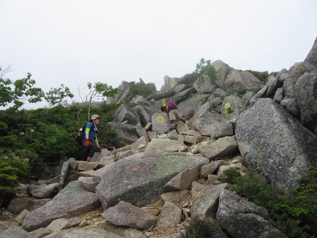 このあたりは石楠花が群生しており、可憐な白い花を着けている。やがて本格的な前常念岳の岩場となる。初登山の女性は、時々ル-トの選定で立ち往生する。それでも、黄色のペイント表示している前常念岳(2,661.8m)まで順調に進む。そのあたりから女性のペ-スが落ちて来る。