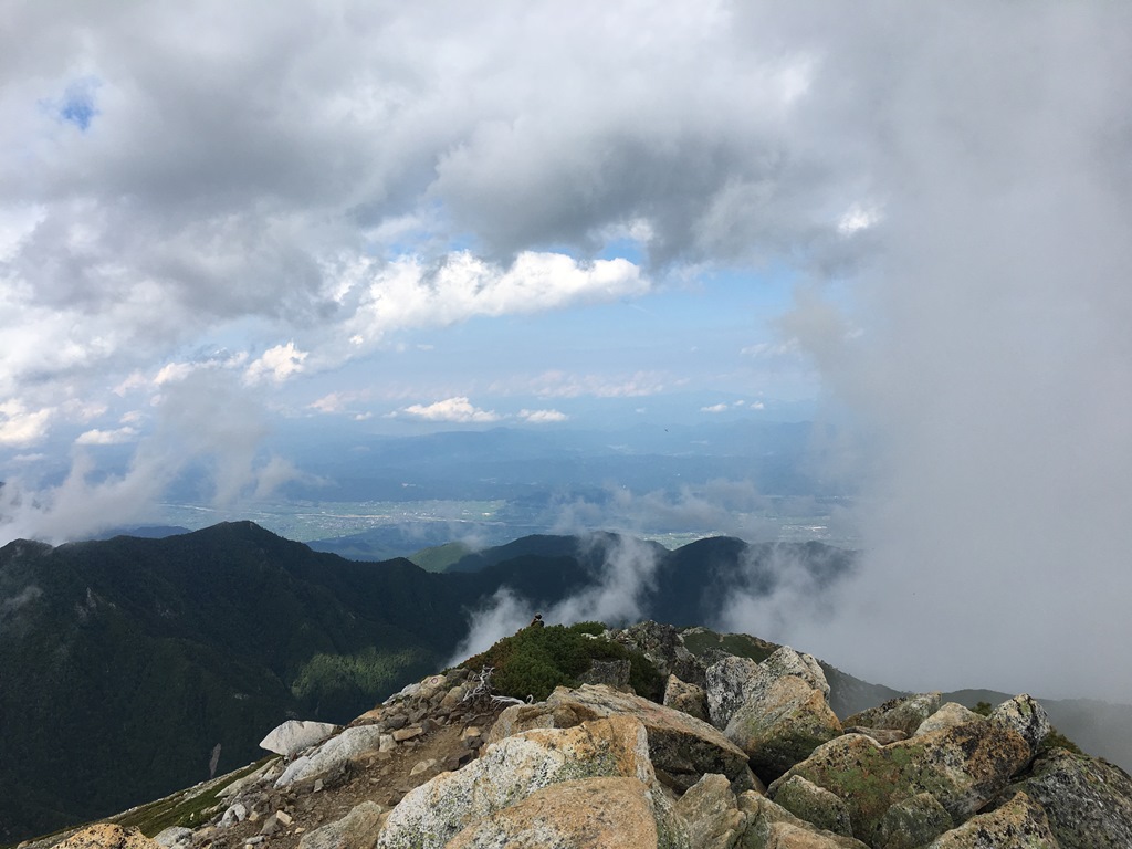 そこから、ゆるやかな斜面を4Km地点まで進む。その間大勢の登山客に追越される。その付近から真新しい木の階段が続く。前回登った時にはない設備だった。第二ベンチ4.7Km付近にさしかかる頃から雨はあがり、常念岳方向の視界が開ける。大滝山分岐まで、時々常念岳から蝶ヶ岳に続く稜線が見え隠れするので、疲れが癒される。大滝山分岐から雲海に浮かぶ八ヶ岳、浅間山が見える。