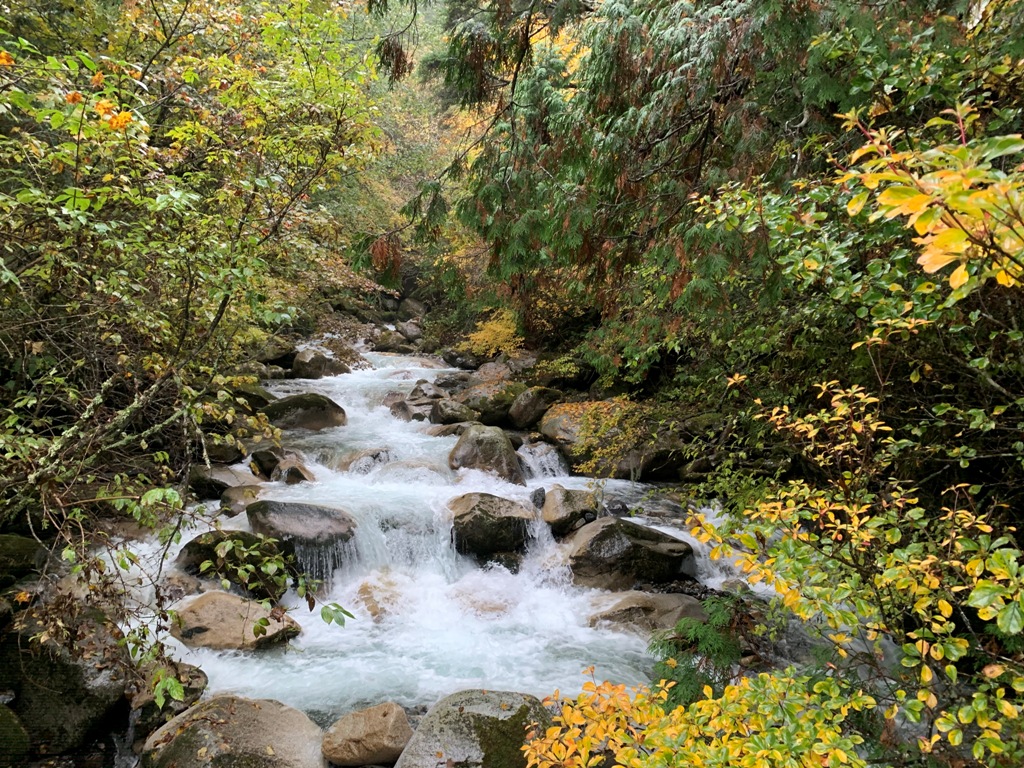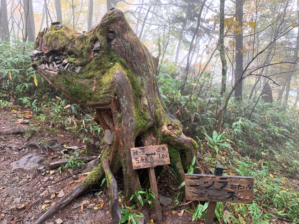 雨の合間に、友人二人と登る。天気予報は曇時々晴だったが、自宅を出ると霧雨だった。私達の体力を考えて5時半に出発する。駐車場に着くと、既に満車状態で僅かな隙間に潜り込む。後続の車は第二駐車場に引返す。こんなに登山客が多いとは思わなかった。20分で三股登山口に着き、登山届を済ませ6時46分に登り始める。直ぐに橋があり、渡ると常念岳との分岐で、そこに蝶ヶ岳6.2Kmの表記がある。本沢は台風19号の影響か、かなり増水して轟音をたてて駆け下る。雲が低く垂込め、霧雨となっている。三股から1Km地点を30分で通過する。ここにはゴジラに似ている枯木があり、口にあたる場所に歯を模して小石が詰込まれている。登山道は歩き易く、まめうち平まで2.5Kmは林道歩きのようだ。