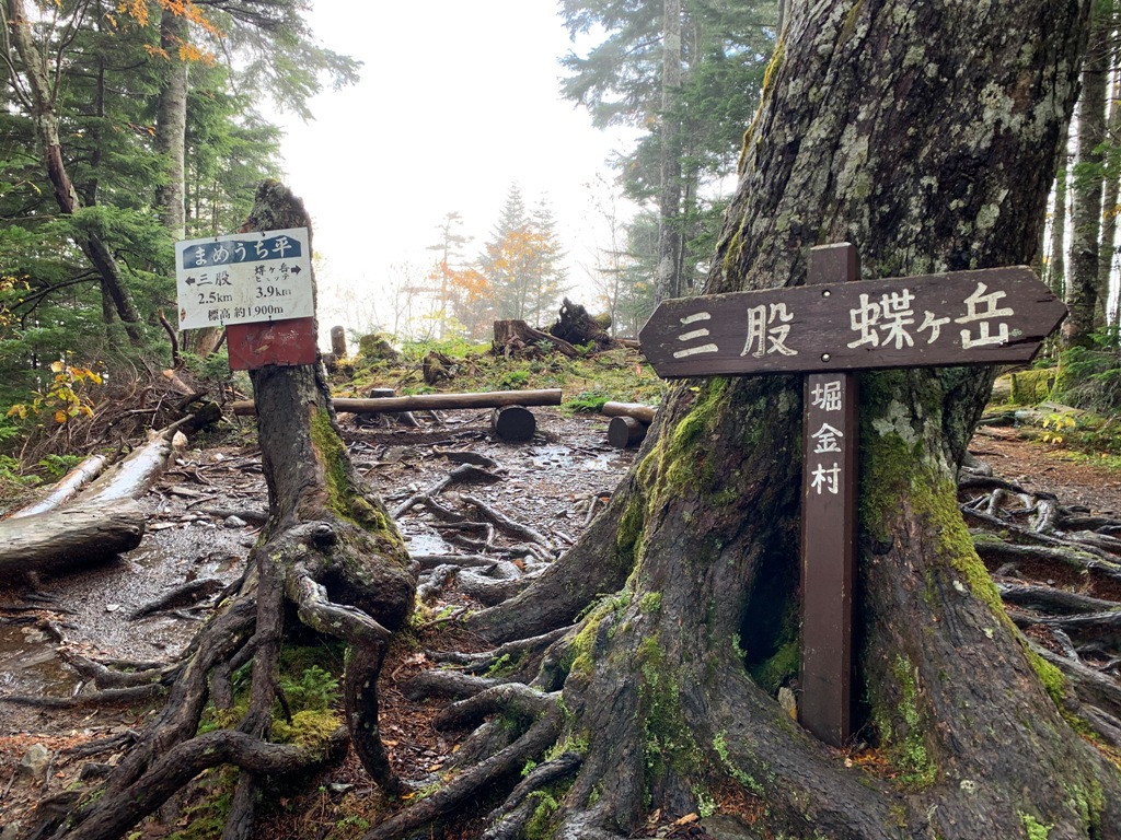 蝶ヶ岳山荘(7:20 1時間40分) ⇒ まめうち平(9:00 1時間5分) ⇒ 三股登山口(10:05 10分) ⇒ 駐車場(10:15)