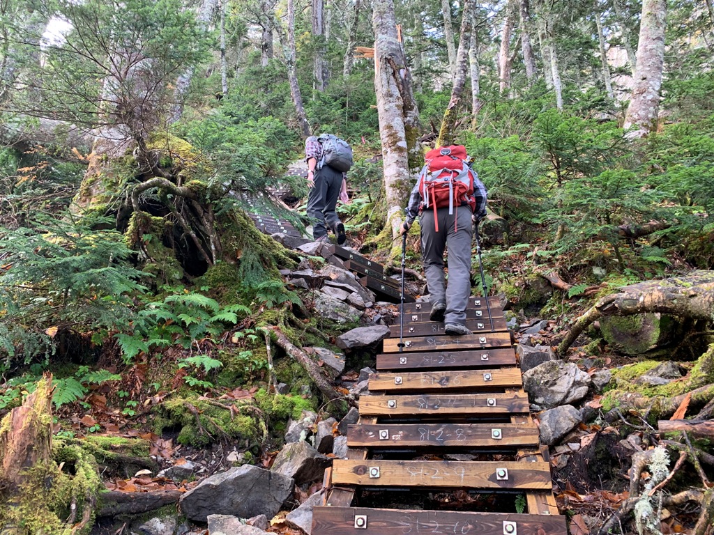 帰路は往路と同じ付近から霧雨となる。木の階段があるので、ぬかるみがなく下り易い。相変わらず大勢に追越される。この時間登ってくる登山客も多い。従って待っている時間が多くなる。結局、三股登山口から往路4時間25分、復路3時間29分の山行だった。駐車場はほぼ満車状態で、第二駐車場も多く駐車していた。ほりでーゆ四季の郷で汗を流し、疲れを癒す。