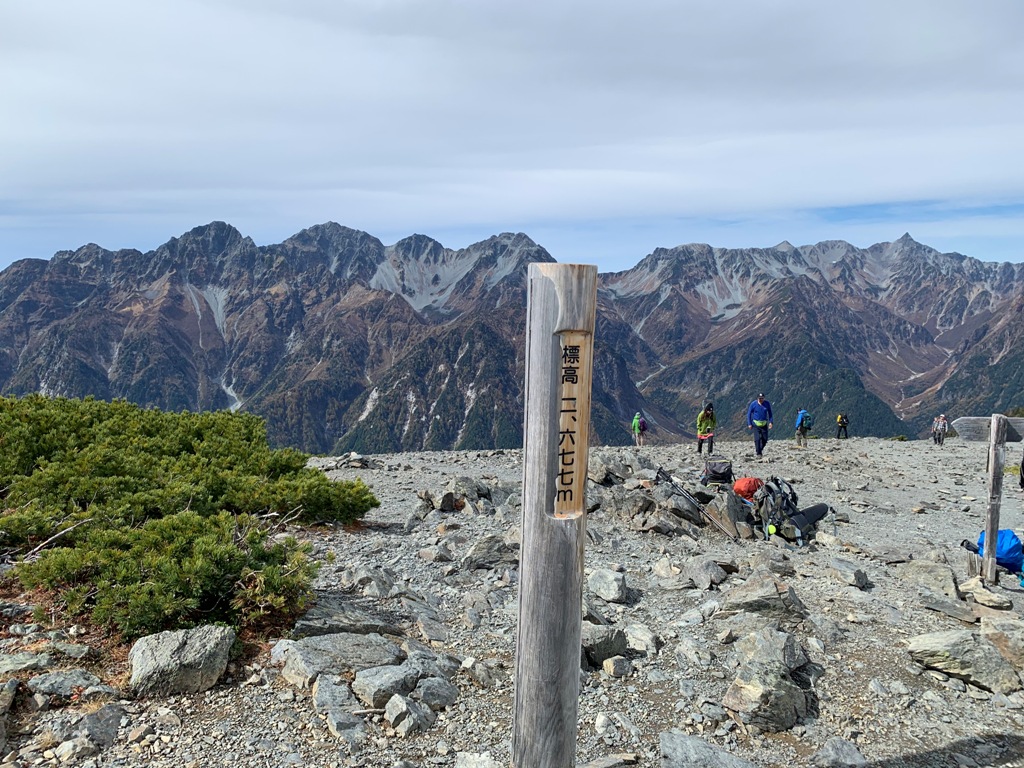 ハイマツのトンネルを暫く進むと、蝶ヶ岳山荘が目の前に現れる。キャンプ場横を抜けると、山頂はすぐそこだ。蝶ヶ岳山頂(2,677m)はなだらかな斜面で、大勢の登山客が留まっている。裾野の雨模様から考えられないすばらしい天気だ。暫く前から勇壮な姿を見せていた槍ヶ岳、穂高連峰にしばし見入る。雲一つなく山肌をさらけ出している。私は、蝶ヶ岳から見る槍ヶ岳、穂高連峰が一番好きだ。何度見ても飽きない。紅葉時期を過ぎているのが少し残念だ。反対に富士山方向は、右から南アルプス、富士山、八ヶ岳、浅間山が雲海に浮かんでいる。山頂付近は上高地側から吹きあげる風で肌寒い。蝶ヶ岳ヒュッテの風下で昼食を摂る。