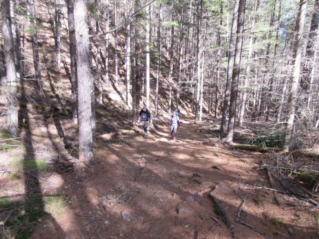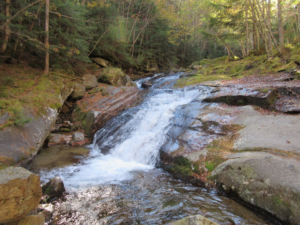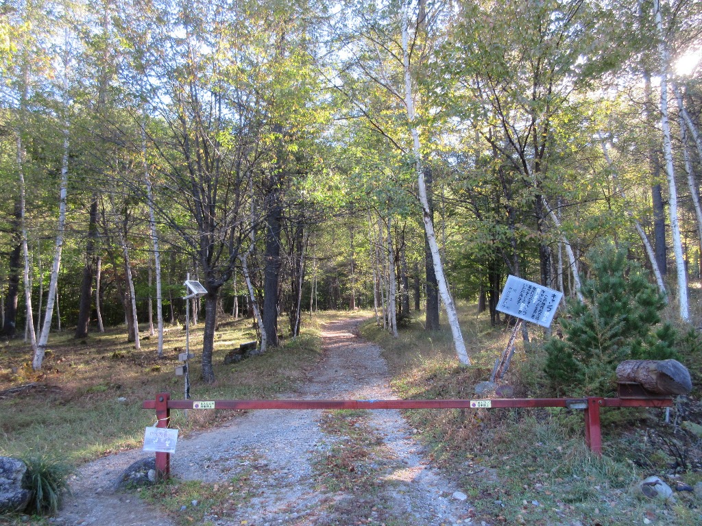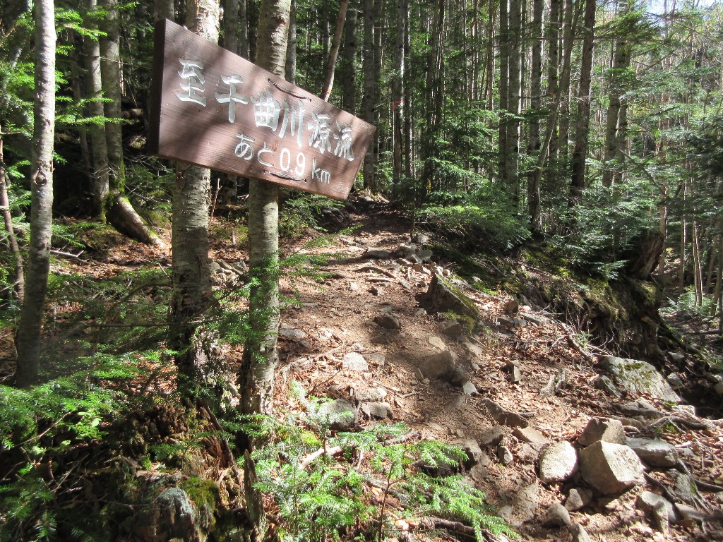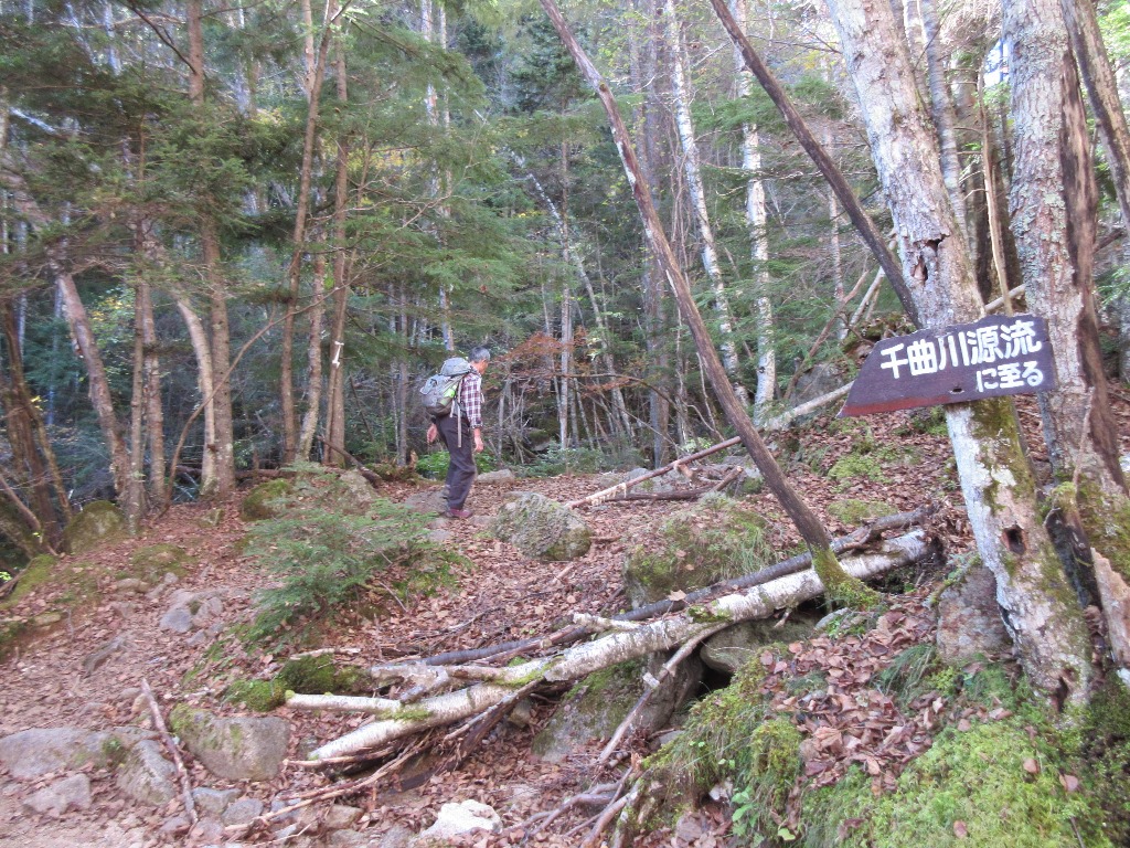 今回の登山は、何回か同行したことのある知人2人と娘の4人パ-ティです。登山コ-スは、日の短いこの時期日帰り可能な毛木平登山口とする。安曇野の自宅から、梓川スマ-トに入り長坂ICを出て、1時間半程で川上村の毛木場駐車場(60台)に着く。到着時刻は7時46分で、駐車場は既に満車状態だった。車止めゲ-トのある甲武信岳毛木平登山口を7時58分に出発する。大山祇神社近くまで車の通れる林道を進む。途中に車が2台駐車していて、林道終点近くには駐車禁止の標識がある。大山祇神社傍に千曲川源流4Kmの表示がしている。千曲川源流まで川沿いに緩斜面の登山道が続いている。登山道は広くなったり狭くなったりの繰り返しです。千曲川とは平行したり、時には高巻きする。それに従い、川音は強弱の変化をする。時々木橋があったり、測流水を渡ったりする。ナメ滝まで、ダケカンバが間隔広く植生しているので、解放感のある空間が広がり、太陽の木漏れ日を浴びる。「千曲川源流に至る」「千曲川源流」の標識がやたらに多い。
