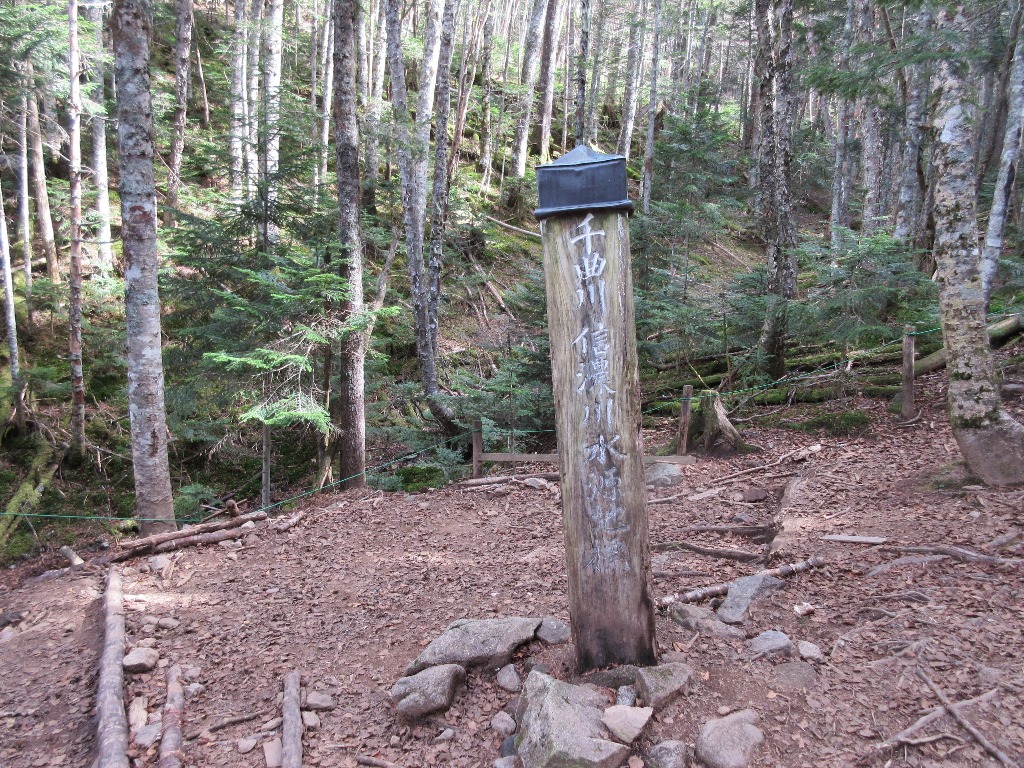 ナメ滝からシラビソ林に変わり、樹林も密集して登山道らしくなる。そこから、さらに千曲川源流までの距離表示が増える。2.1Km、1.8Km、1.45Km、0.9Km、0.35Kmと。甲武信岳はどこへいったのかな。ナメ滝から1時間10分で、千曲川信濃川水源地標のあるフラットな場所に着く。少し降りた所に、千曲川源流地点がある。ここから上は地下水流になっているのだろうか。源流の水で水分補給し、暫く休憩する。