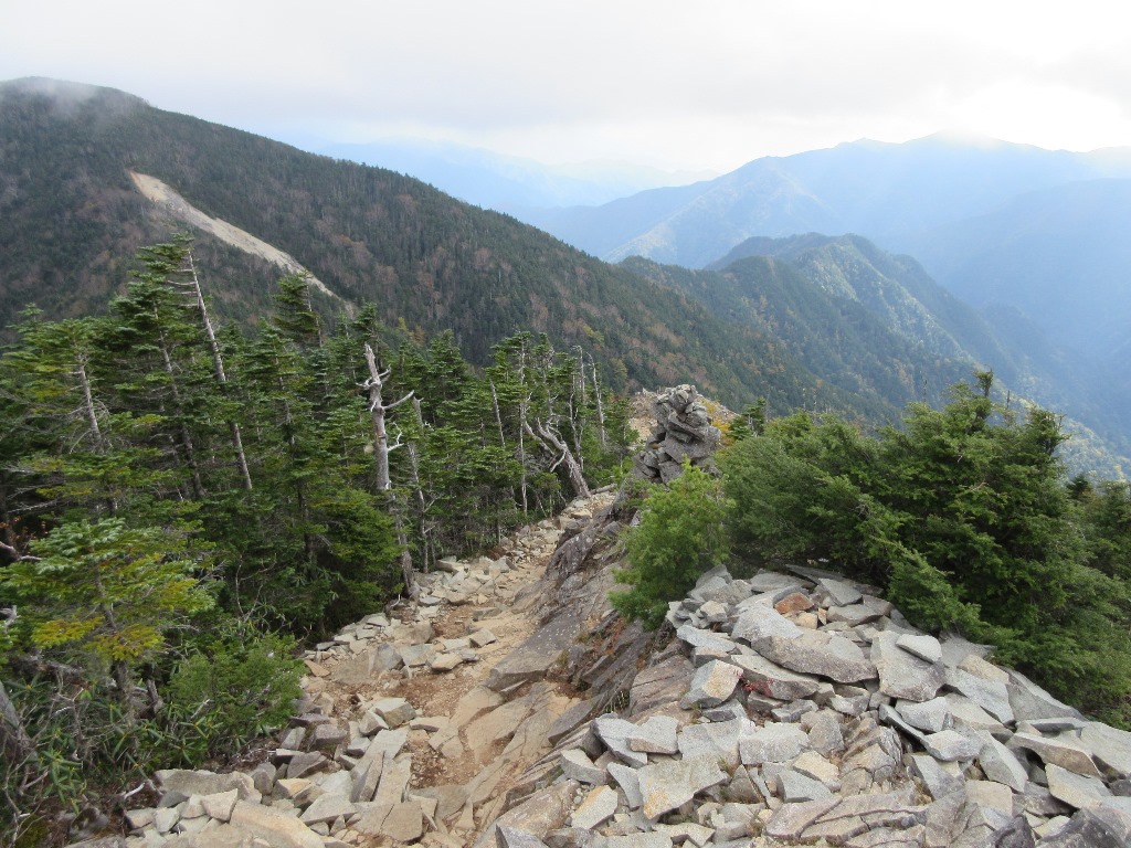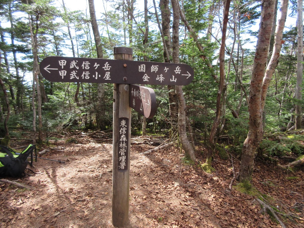 ここから急坂を20分程登りきると尾根道に達する。右方向は、国師ヶ岳、金峰山に至る縦走路で、甲武信岳は左方向に進む。ここまで来れば山頂は間近だ。しばらく石楠花の葉が見られる低木帯を進むと、視界が開け岩稜になり、すぐ甲武信岳山頂(2,475m)に達する。山頂は昼休憩する人で賑わっている。あいにく富士山は裾野だけしか見えないが、北方向は北アルプスまではっきり見通せる。登頂写真を撮り、しばし景色を楽しむ。少し肌寒いため、トイレと昼食のため甲武信小屋まで降りることにする。ここで小一時間過ごす。その間数組の登山者が訪れる。甲武信小屋近くに荒川水源の碑があるが、誰も行くとは言わなかった。