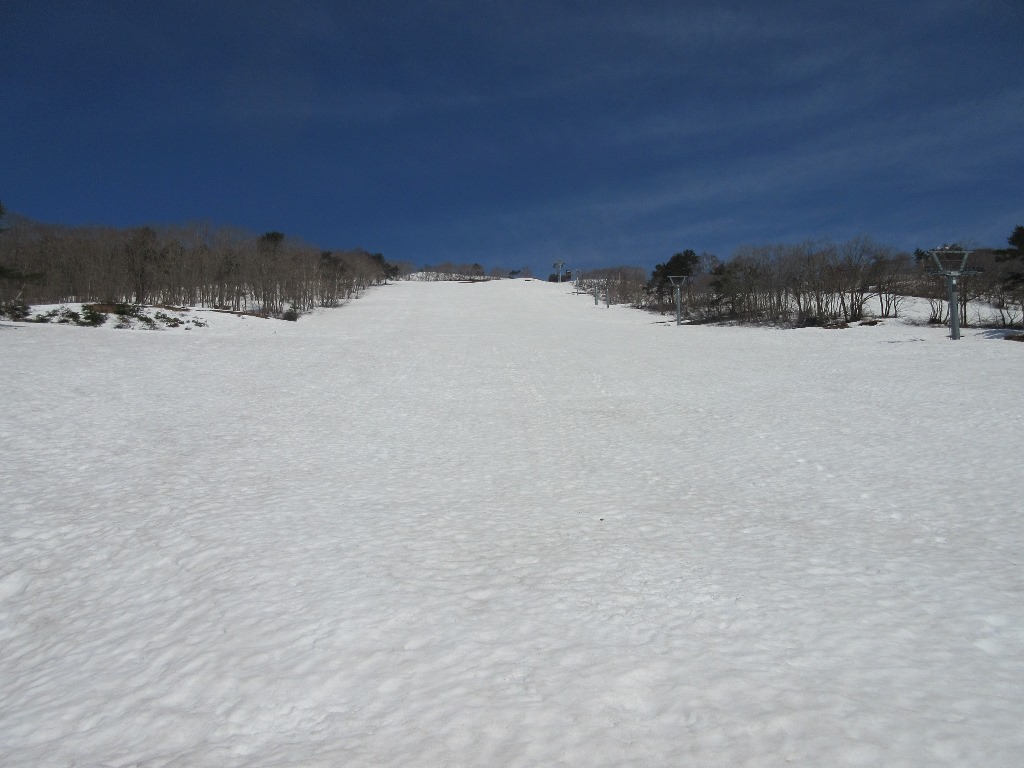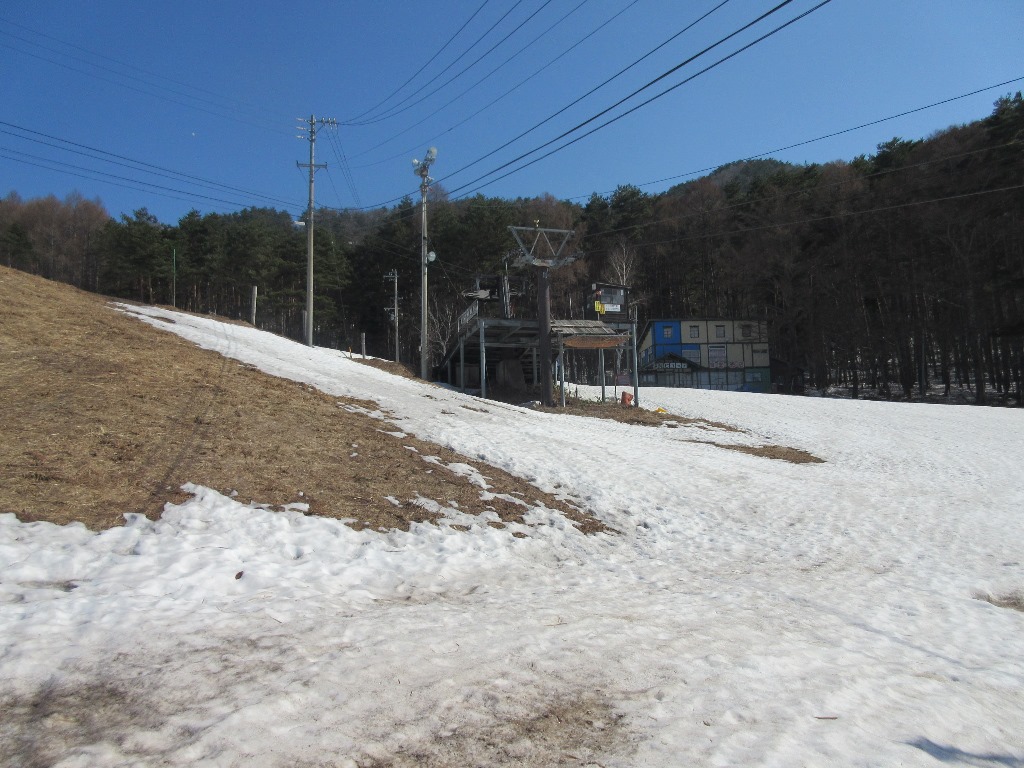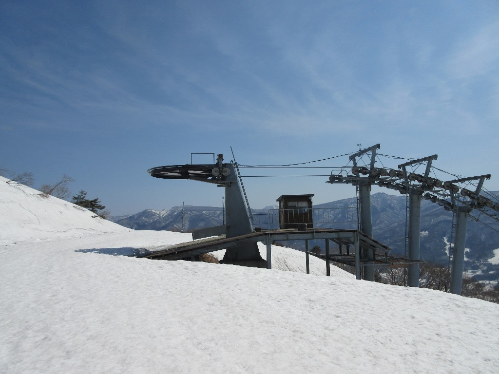 中野市のシンボル高社山が今年最初の山行です。この時期の信州の山は、低山を除いて残雪がある。今年は例年に比べて雪が多いようである。長野マラソンに出場する妻をスタート地点のアクアウィングに降し、登山口のよませスキ-場に向かう。当初赤岩登山口から登ろうと思ったが、妻がゴ-ルする時間に南長野運動公園に行けない可能性があるので変更する。よませスキ-場はかなり雪が残っており、スキ-可能であったが既にクロ-ズしていた。雪のないよませ温泉スキ-場第1リフト下の駐車場に車を停める。8時40分に目前の遠見ヒュッテを目指してゲレンデを登り始める。雪は程々にしまっているので、アイゼンは着けず。ゲレンデをリフトに平行して直登する。太陽の照り返しで暑い。リフト点検のための雪上車に2回出くわす。第2クワッドリフト上部まで40分を要す。そこから急勾配の斜面となり、第1リフトの上部に20分弱で達する。そこから志賀高原の山々、妙高山まで眺望が開け、善光寺平が一望出来る。