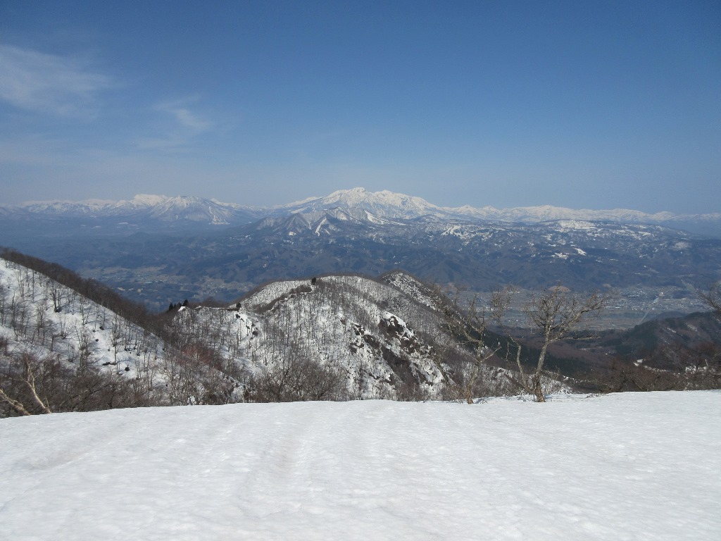 尾根筋まで登山道が判らないので直登する。5分程で尾根に出る。高社山頂に至る雪の尾根が、はっきり見通せる。1時間11分で高社山(1,351.5m)登頂を果たす。山頂はすっかり雪に覆われ、形がはっきりしない。展望台の一部がかろうじて露出している。今日は天気がいいので、360度の大パノラマだ。善光寺平の向こうに北アルプスが霞んで見える。北信五岳は指呼の先に広がっている。志賀の山々とスキ-場のゲレンデがはっきり見通せる。一人だけの山頂で、景色を暫く楽しみ、下山を開始する。雪の尾根道は転落の恐れがあるので、注意しながら下る。それでも10分程で第1リフトに着く。そこからよませスキ-場ゲレンデを韋駄天走りで駆け下る。なんと11分で駐車場に着く。雪が無ければ不可能な21分で下山する。