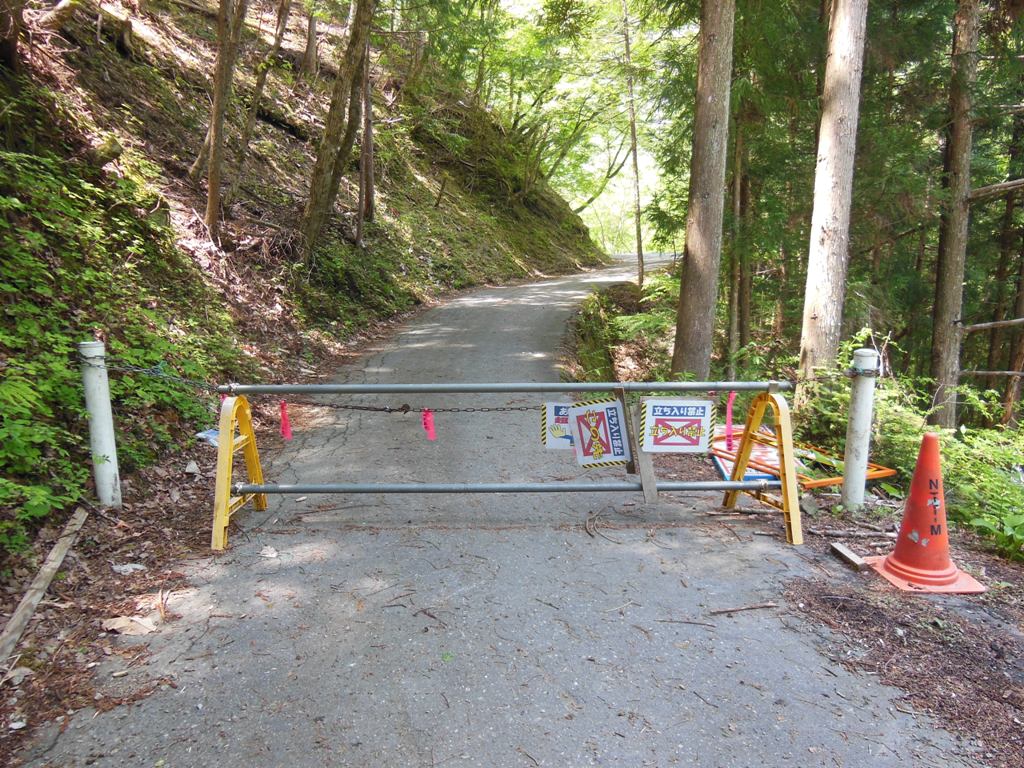 全線開通出来ない幻の国道といわれる152号線を、ゲートのあるところまで入る。駐車場はないのでゲート前に停める。長い単調な林道を1時間近くかけて林道登山口に達すると、