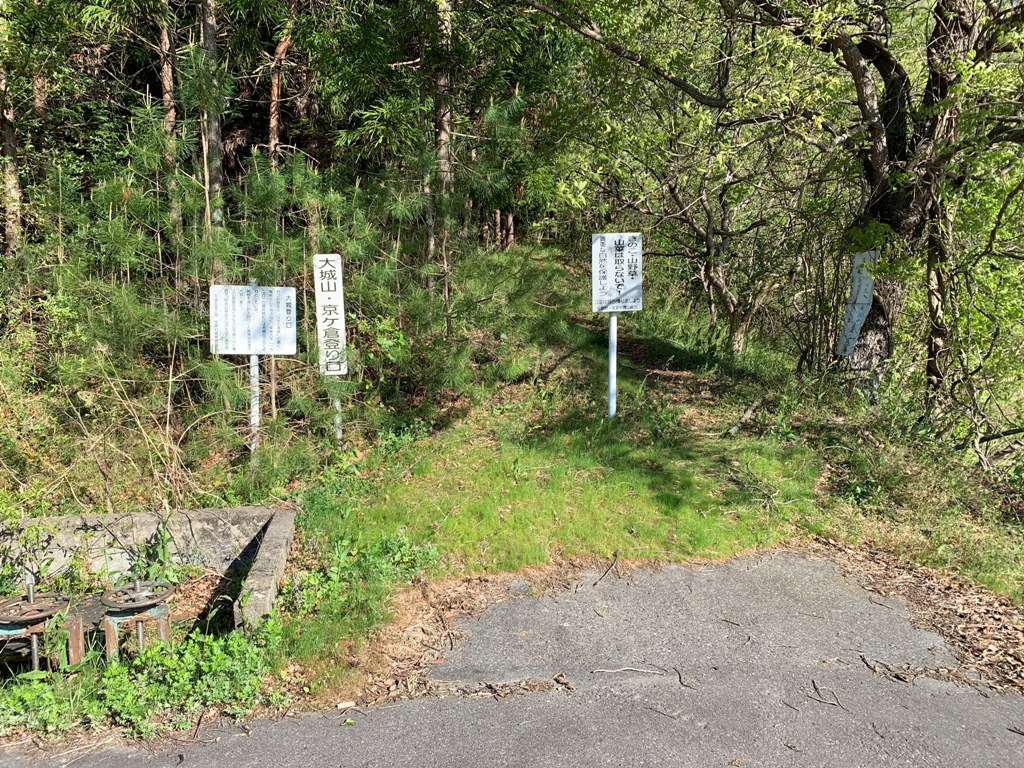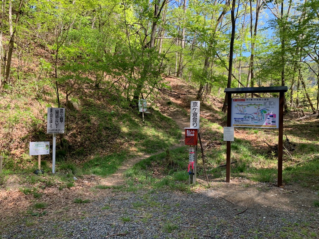 国道19号の生坂トンネル南信号から県道275号に入る。生坂小学校の道標より舗装された村道に進む。京ヶ倉の道標に従い車を走らせると、万平の丸山氏の居館跡、道路に沿った松並木、 旗塚、石仏群七基の史跡を過ぎた先の林道万平線入口の防獣扉に着く。防獣扉を開閉して、林道を500m程行くと「林産集落振興事業作業用建物」があり、程なく京ヶ倉登山口に着く。 ここに駐車スペ-スと京ヶ倉・大城登山道図がある。京ヶ倉・大城は2回目の登山です。前回(2011/10/9)は登山が目的だったので、大城まで行って引返す。今回は大城跡を見学することが目的だが天気が良かったので、京ヶ倉・大城を縦走し、遺構が多い下生坂側に下りることにする。大城跡見学だけだと、国道19号沿いの下生坂側から登り、引返すのが時間的に早い。