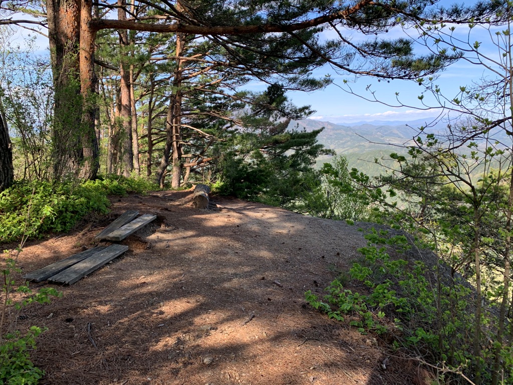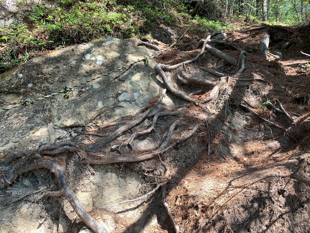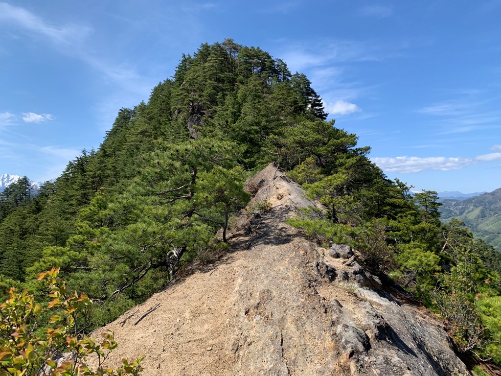 ここから京ヶ倉までは、ゆるやかな稜線歩きとなり京ヶ倉が姿を現します。巻き道と馬の背の分岐を眺めの良い馬の背方向に進む。馬の背は大きな岩の上の道で、左右が切れているがロ-プを張ってあり恐怖感は感じない。そこから最後の急な岩場を登りきると京ヶ倉山頂だ。京ヶ倉は標高 990m生坂山脈の最高峰で、戦国時代に大城番兵の見張り台と、のろし台だったと案内板に記していた。ここまで登山口から52分で着く。