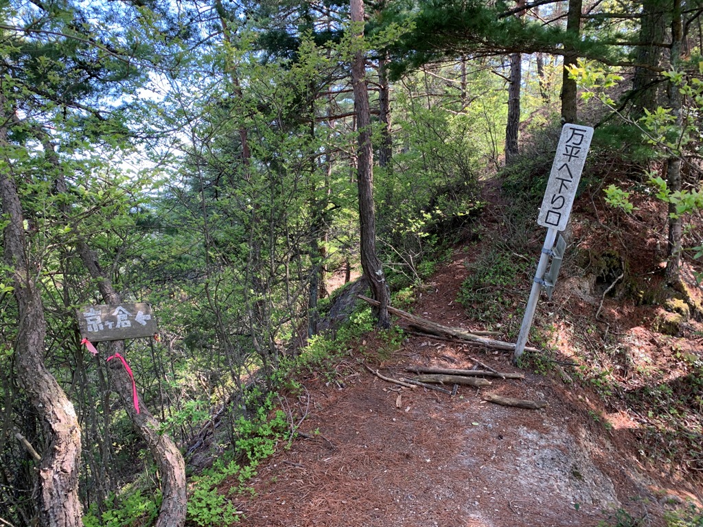 小ピ-クの中腹を迂回して北斜面に出る道を進み、尾根の南側に出ると松林の急な登りとなる。中腹のおお こば見晴台に着き、ほゞ中間地点となり一息つく。 ここから生坂ダム、水鳥公園の眺めが素晴らしい。更に進むと道標「京ヶ倉方面」があり、道は再び尾根の北側になる。ロ-プ、ハシゴのある急坂を登り、尾根に出ると万平下り口の道標がある。