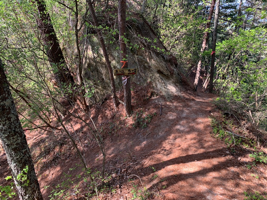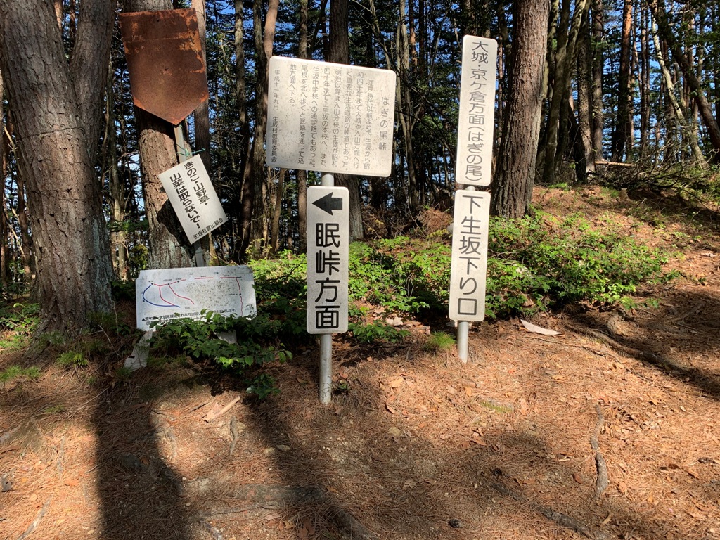 京ヶ倉から一旦下り、稜線を暫く行くと北アルプスの見晴らしが良い場所がある。そこから双子岩を抜け5分程登り返すと大城(980m)に着く。ここまで登山口から1時間12分で着く。前回、京ヶ倉登山はここで引返すが、今回城跡巡りが目的なので、縄張り見学のため、ここから縦走する。二の曲輪、三の曲輪を見学して、急坂を下るとフラットな尾根となる。途中、北アルプスの展望所を通り、標高920mの物見岩に着く。更に尾根伝いに進むと筑北側が開けた場所がある。そこから程なくはぎの尾峠に着く。このあたりは三の曲輪らしい。ここに、遠回りになるが、展望が良いので眠り峠ル-トをお薦めしますの案内がある。展望は十分楽しんだので、ここから直接下山することにする。下山路は広いが、枯葉が蓄積し滑り易いし、所々倒木があり道が塞がれる。30分程で下生坂側登り口に着く。そこから、国道19号、県道275号を歩いて車まで戻るのは、距離があり気分的に疲れた。
