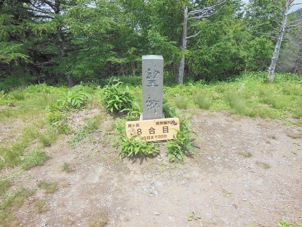 大泉ダムコースは、登山口から2合目までが林道で、木橋を渡ると登山道となる。高山植物を撮りながら、ゆっくりしたペースで進む。笹原の中にササユリが盛りで、あちこちに可憐な花を咲かせていた。8合目に望郷の碑があり、中央・南アルプスの眺めがすばらしい。そこからはアップダウンの繰り返しで、展望もないので時間を長く感じる。36分で経ヶ岳山頂(2,296.3m)に着く。山頂は樹林に覆われ、展望はきかない。御嶽天神の石碑群が、その環境にマッチしている。坊主岳に登った時も御嶽に纏わるものがあり、この辺は御嶽信仰があるらしい。曇り空のため、肌寒い。