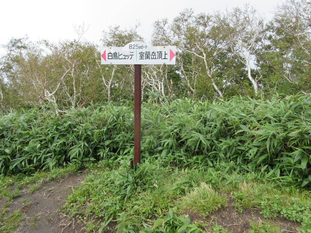 北海道100名山の旅であったが、トムラウシ、幌尻岳を道路寸断のため登れなかったので、計画外の室蘭岳に登ることにした。私は2度目の登山で、相方は初めて登る。宿泊所の登別温泉石水亭を9時48分に出て、室蘭岳駐車場に10時49分に着く。台風一過で天気は良いはずだが、多少雲が多い。室蘭岳山頂も少し雲がかかっている。登山口を10時51分から歩き始めた途端、倒木で登山道が各所で塞がれていた。迂回しながら、白鳥ヒュッテまで12分で行く。登山道は樹林帯から笹原に変り、倒木の心配はなくなる。白樺林を越えると視界が開ける。西尾根コ-ス分岐を過ぎると、すぐに山頂に着く。室蘭岳(911m)は、1時間をきる55分で登頂する。暫くすると、途中追抜いた先生に引率された小学生グル-プが着く。賑やかに食事が始まる。
