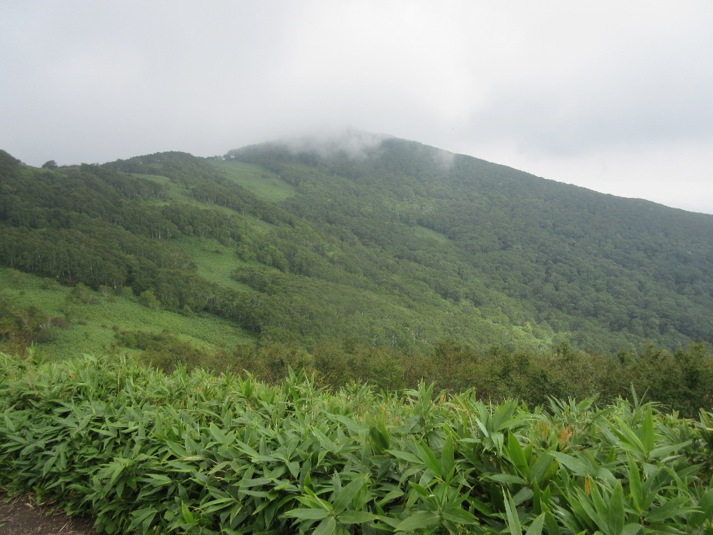 山頂はガスがかかり、視界がなかったので、私達は早々に下山を開始する。往路は夏道コ-スで、復路は西尾根コ-スとする。少し下山すると、ガスが無くなり視界が開ける。室蘭市街まで見通せる。笹原の見晴らしの良い登山道を20分程歩くと825mピ-クに達する。室蘭岳山頂は時おりガスがとれる。そこから急坂を一気に下ると樹林帯になる。沢を渡ると、程なく白鳥ヒュッテに着く。登山口には13時5分到着で、復路は距離が長いので1時間5分要する。室蘭市民の山で、楽に登れる山だ。