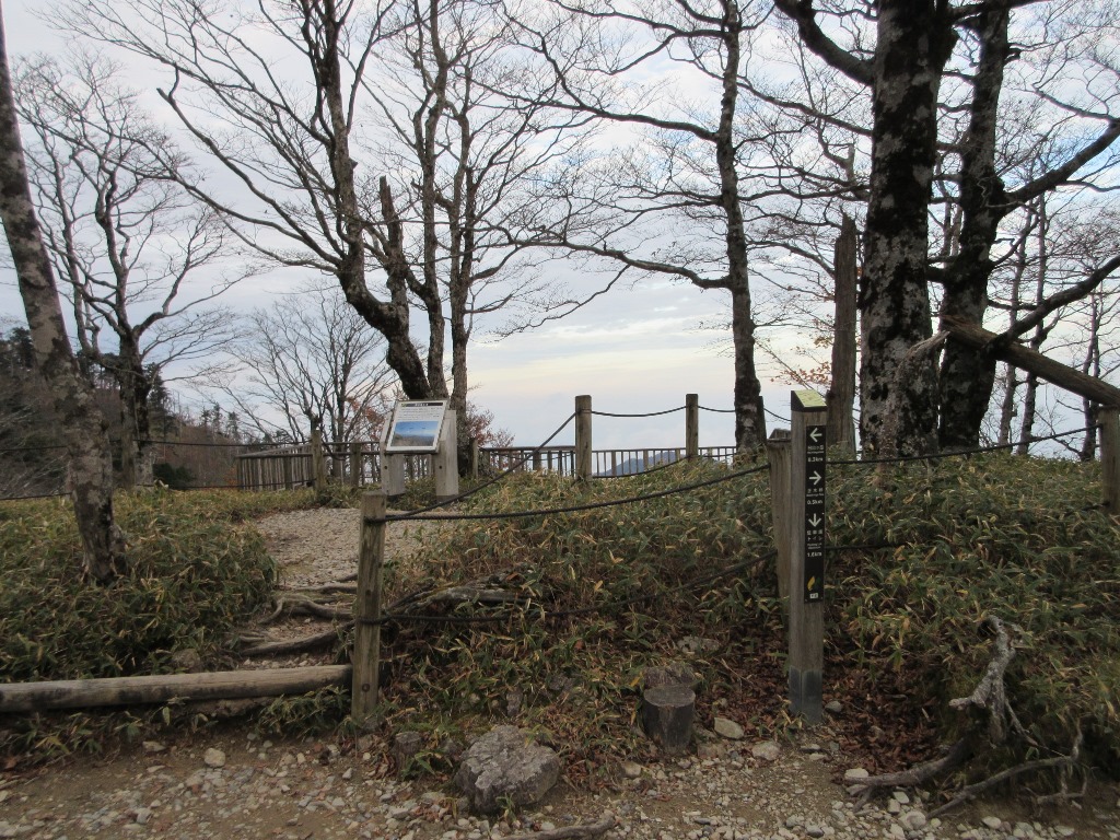 行者還トンネル西口登山口の下山時間は13時36分なので、行者還トンネルから先の国道309号線が通れれば、余裕で大台ヶ原の日出ヶ岳に登れるのだが。この日は残念ながら崩落のため通行止めである。時間が遅くなることを覚悟で、国道169号線まで戻る。国道309号線に比べて、格段に道路状況が良かったので、大台山上駐車場到着は2時間29分後の16時5分だった。予定より1時間以上のロスである。近くの人に日出ヶ岳登山口を聞くと、これから登ると日が暮れるといわれる。ここまで来たら登るしかないと、ライトを用意して出発する。登山道は良く整備された遊歩道で、運動靴で大丈夫だ。八幡平と似たような感じで、山群の最高峰だけ登るのだと登山とは言えないかも。周辺の山域を含めた山歩きをすべきだろう。今回は時間がないので諦める。正木峠との分岐までの1.6Kmを19分で駆け上る。そこから山頂までは木の階段が続く。日出ヶ岳(1,695m)展望台には23分で着き、明るい時間帯で周囲の山並みを見ることが出来た。下りは普通に歩いたので、28分で往路より時間を要した。それでもまだ明るかった。大台ヶ原ドライブウェイの途中で日が落ちたが、雲が多く夕日は確認出来ず。紅葉は端境期を過ぎ、色褪せていた。帰りは高速道路を利用したので、友人の自宅堺市南区若松台に2時間10分で着く。道路不通により計画変更を強いられたが、予定通り紀伊の100名山を2座登ることが出来た。