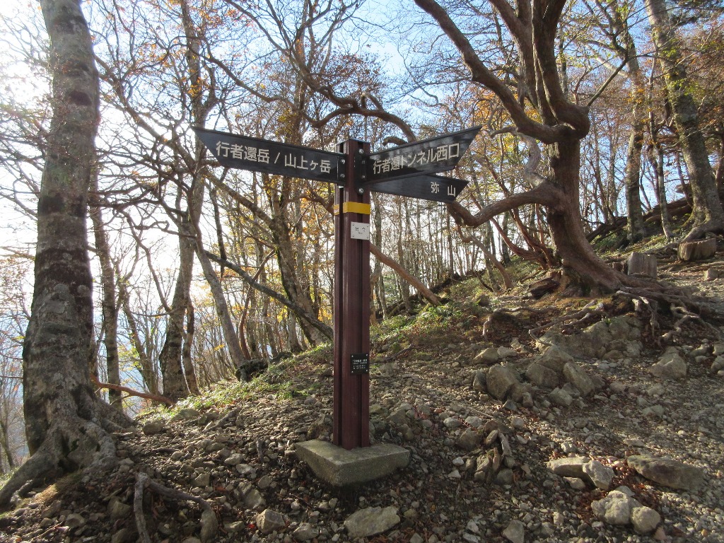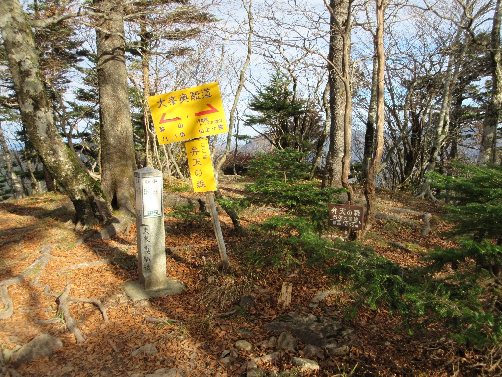 2015年7月25日の薬師岳に同行した友人2人揃ってのひさしぶりの登山です。今回は堺市南区若松台に住む友人宅に前後泊し、大峰山_八経ヶ岳(1,915m)、大台ヶ原_日出ヶ岳を日帰りする登山です。友人宅を早朝5時半頃出発し、国道309号線を通り行者還トンネル西口駐車場に7時5分到着する。行者還トンネルに至る手前10Km程は、国道309号線となっているが、すれ違い困難な1.5車線程の道路です。行者還トンネル入口に崩落のため不通の表示があり、大台ヶ原への最短ル-トが閉ざされる。大台ヶ原は八経ヶ岳下山後に考えることにする。1,000円の駐車料金を支払い、行者還トンネル西口登山口を7時15分に出発する。出始めは川に沿った広い登山道で、暫く進むと急な尾根になる。沢山根の張り出した、落葉ではっきりしない登山道だ。尾根伝いなので迷うことはない。紅葉は終わりに近いが、時折鮮やかな色付きの木を発見する。奥駈道出合に54分で到着する。行者還岳、山上ヶ岳はここで分岐する。休憩を兼ねて、大峰山系の景色に見入る。そこからなだらかな上りとなり、20分で開けた弁天の森に着く。この地点が最初のピ-クである。