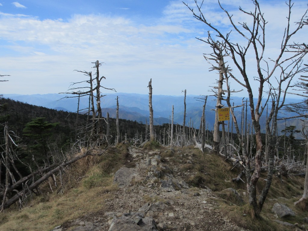 天河奥宮を参拝して、弥山小屋に戻る。弥山小屋横が八経ヶ岳登山口になっている。八経ヶ岳へは、一旦下り、上り返すことになる。樹林帯を枯木の目立つ鞍部まで10分程下る。そこから15分程登れば八経ヶ岳(1,915m)山頂だ。途中鹿によるオオヤマレンゲ食害防止の柵が施されているので、柵の開け閉めがある。
