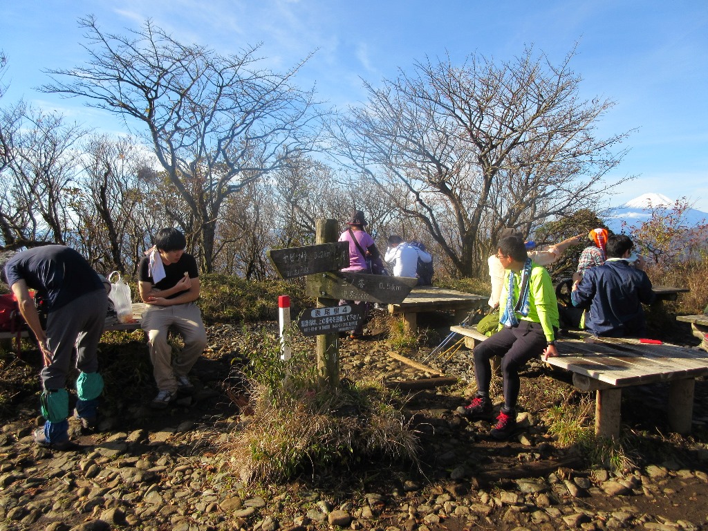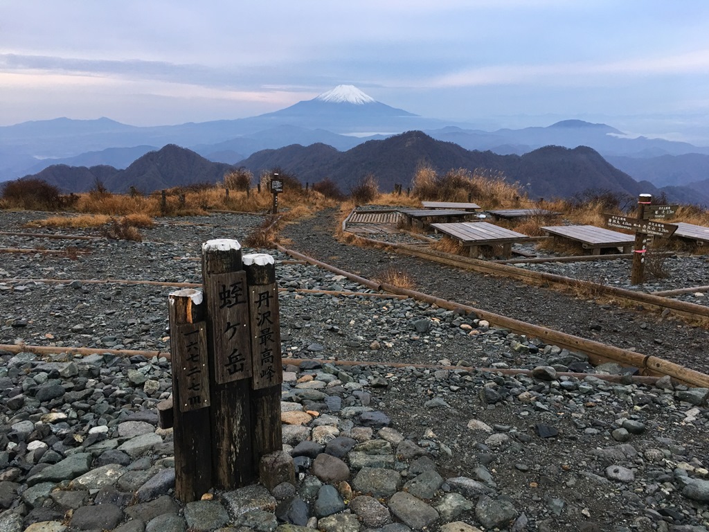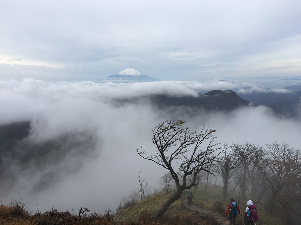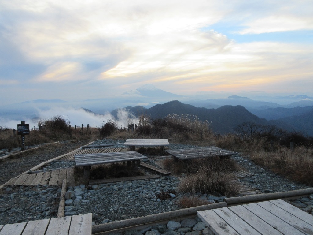山小屋からのご来光は、僅かに太陽が顔を覗かせ、周辺を赤く染めている。山頂広場に行くと、昨日より鮮明に富士山が見える。雪を被った富士山は一番絵になる。食事を済ませ、7時25分に西丹沢自然教室に向けて下山する。富士山は雲海の上に浮いていたが、やがてガスに隠れる。最初からロ-プ、鎖のある急坂の下りだ。登山道は狭く、両サイドは灌木帯で、時折棘で足を刺される。鞍部まで下りきると、臼ヶ岳まで、狭い尾根と木段のあるアップダウンを繰り返す。臼ヶ岳(1,460m)から神ノ川乗越まで下り、金山谷乗越までかなり急なアップダウンを繰り返す。そこから青ヶ岳山荘まで単調な尾根道を登るので、非常に長く感じる。特に青ヶ岳山荘まで150mは長かった。檜洞丸に10時32分に着いたので、所要時間3時間7分だ。山頂は樹林とガスのため視界なし。檜洞丸山頂の標識に、檜洞丸青ヶ岳と記していた。